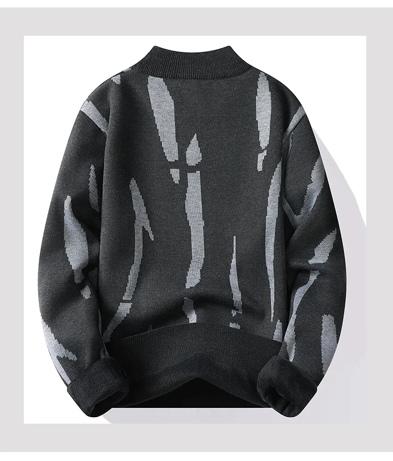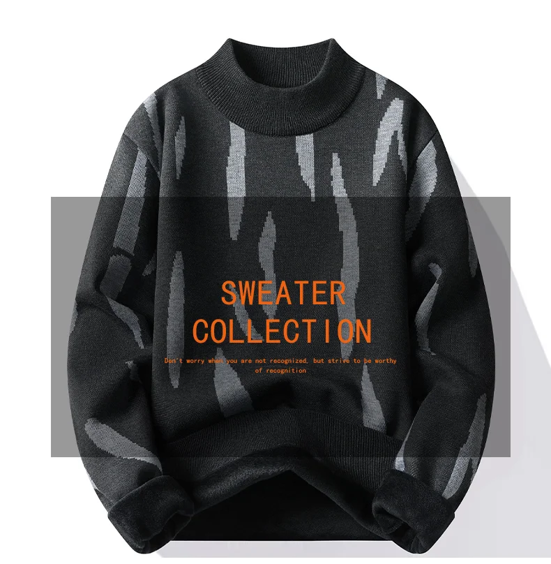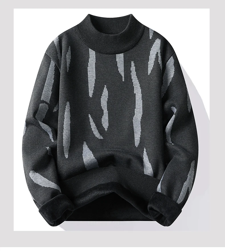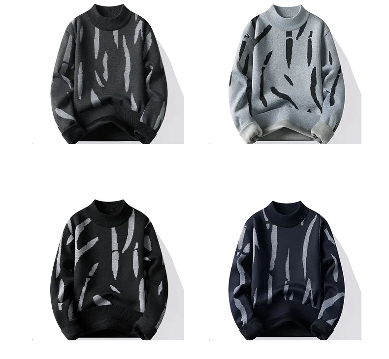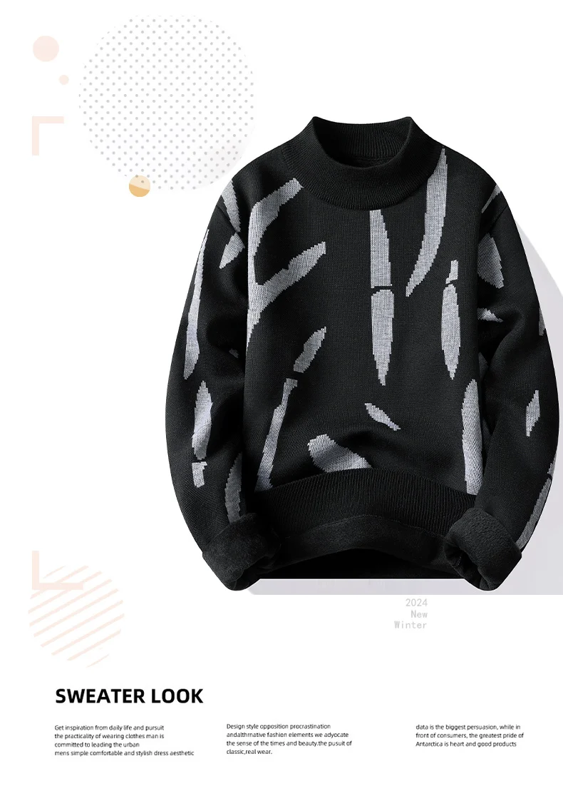 2024 M-4XL Autumn/Winter New Men's Sweater Half High Collar Zebra Pattern Color Blocked Velvet Knitted Sweater Warm Hoodie Top
