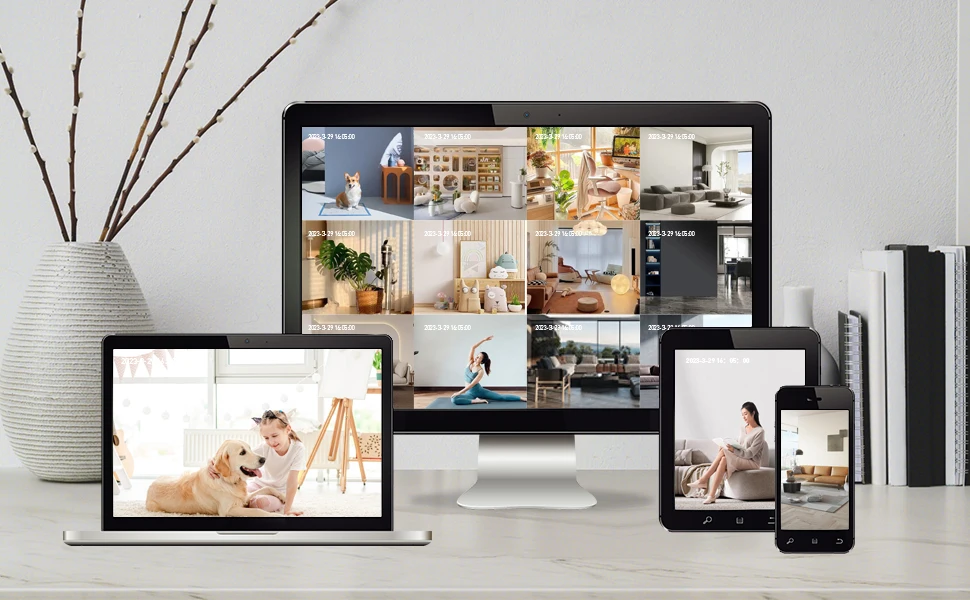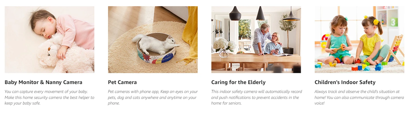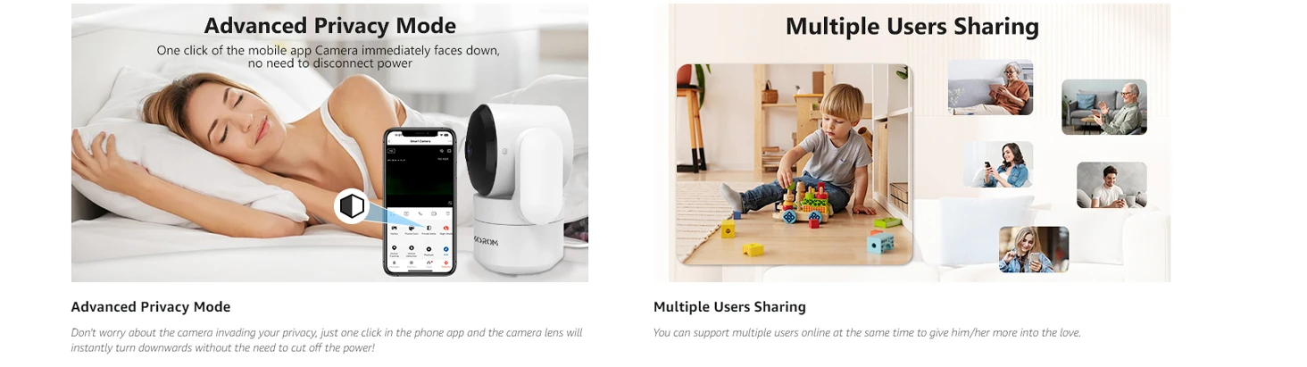 home security cameras indoor supports unlimited users to watch simultaneously through Amorom app. You can share some interesting moments with your friends and family.Amorom APP can add multiple cameras for home security to display 16 live videos on one screen, it is more convenient for you to view multiple areas of your home at the same time. Never miss any important moments when you are not at home.