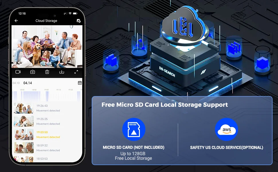 AMOROM Security Camera supports Micro SD card (up to 128GB, not included) and cloud storage (7 days free trial, optional), AMOROM is very concerned about customers' privacy, so the SD card and cloud storage are protected with special encryption, and can only be viewed by your mobile device.