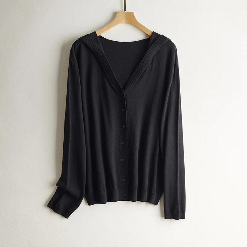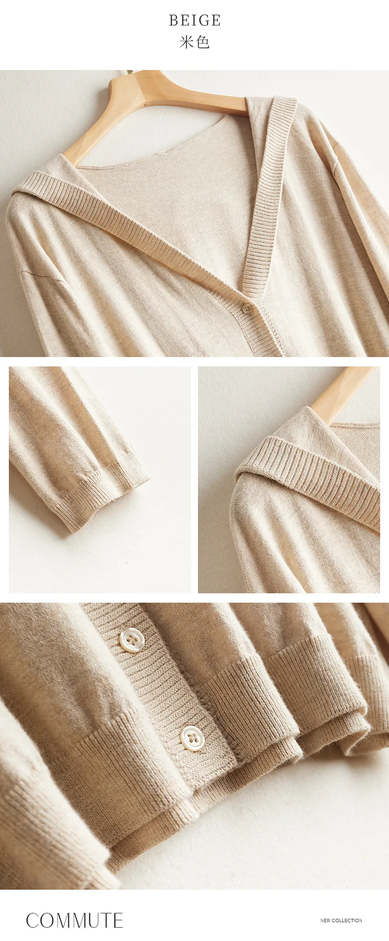 Birdtree 63.9% Silk Cashmere Blended Cardigan Hooded Loose Long Sleeve Knitted Coat Solid Casual Women's Top Autumn New T38533QM
