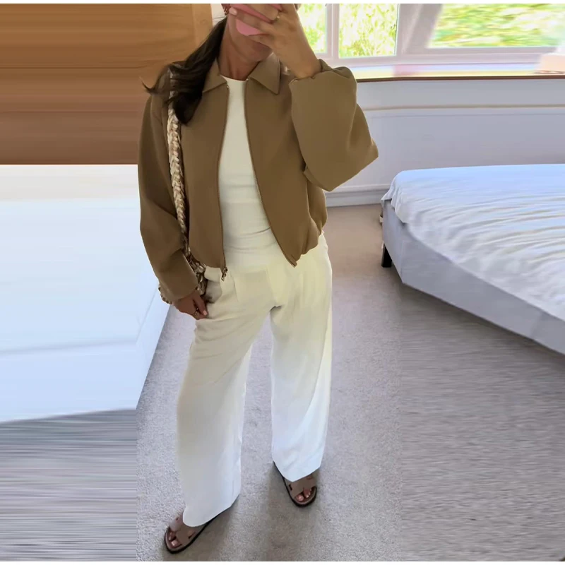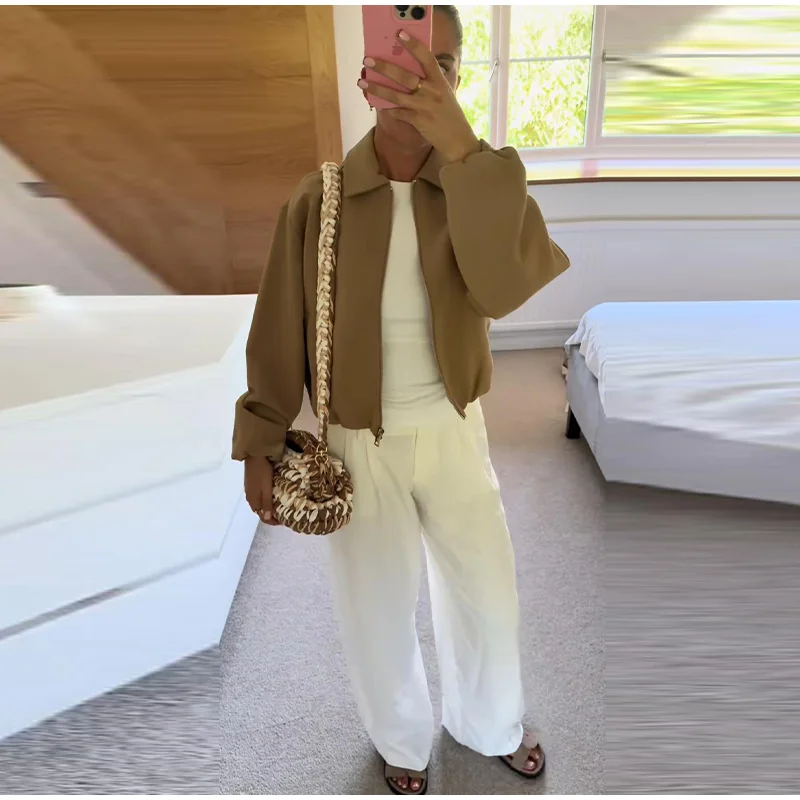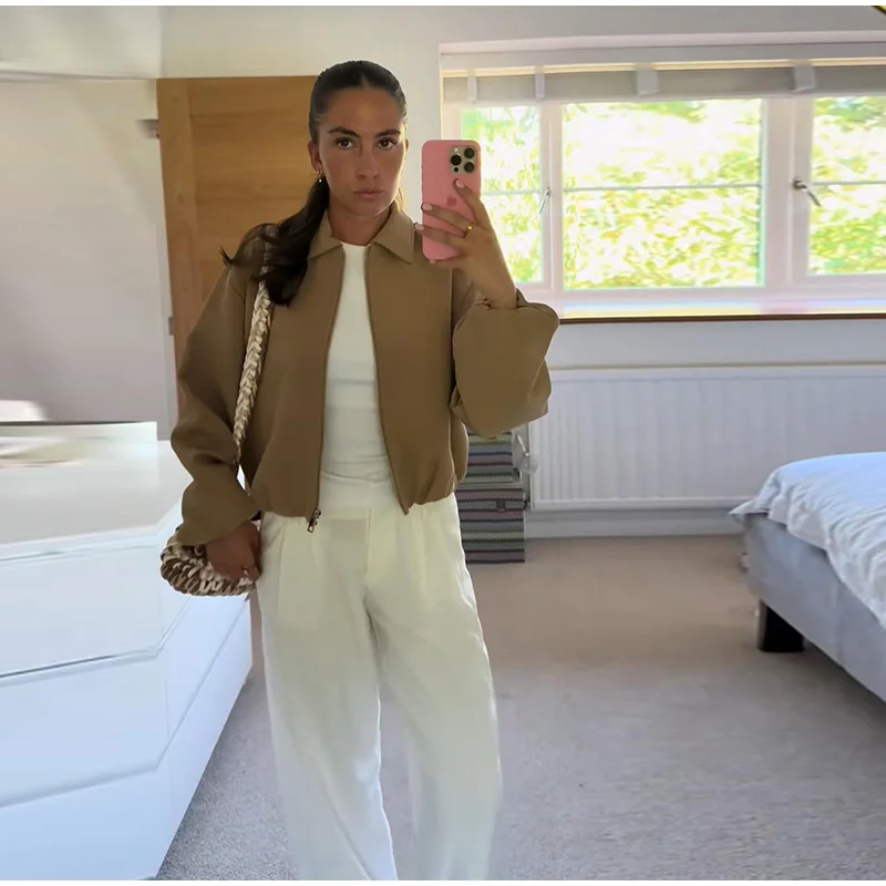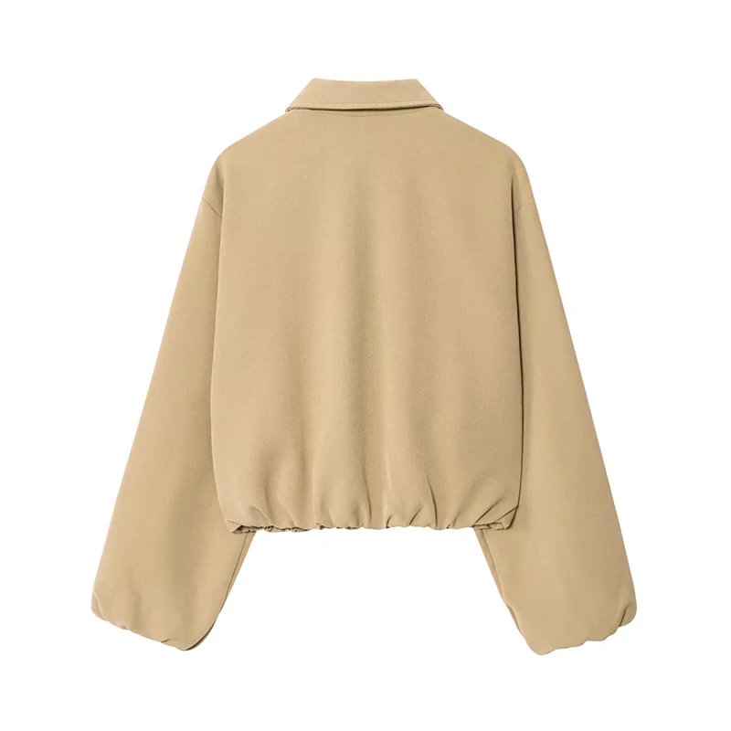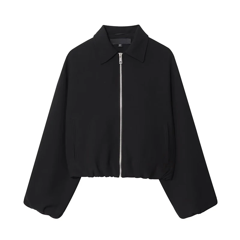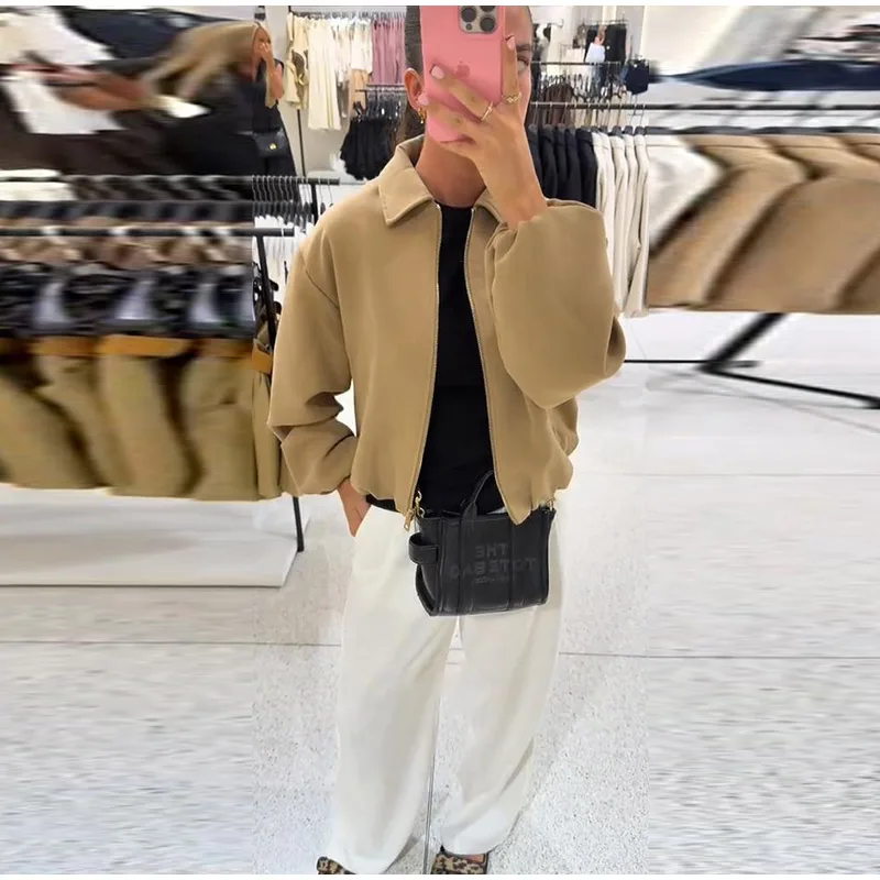 Casual Solid Zipper Lapel Short Jacket Women Long Sleeve .