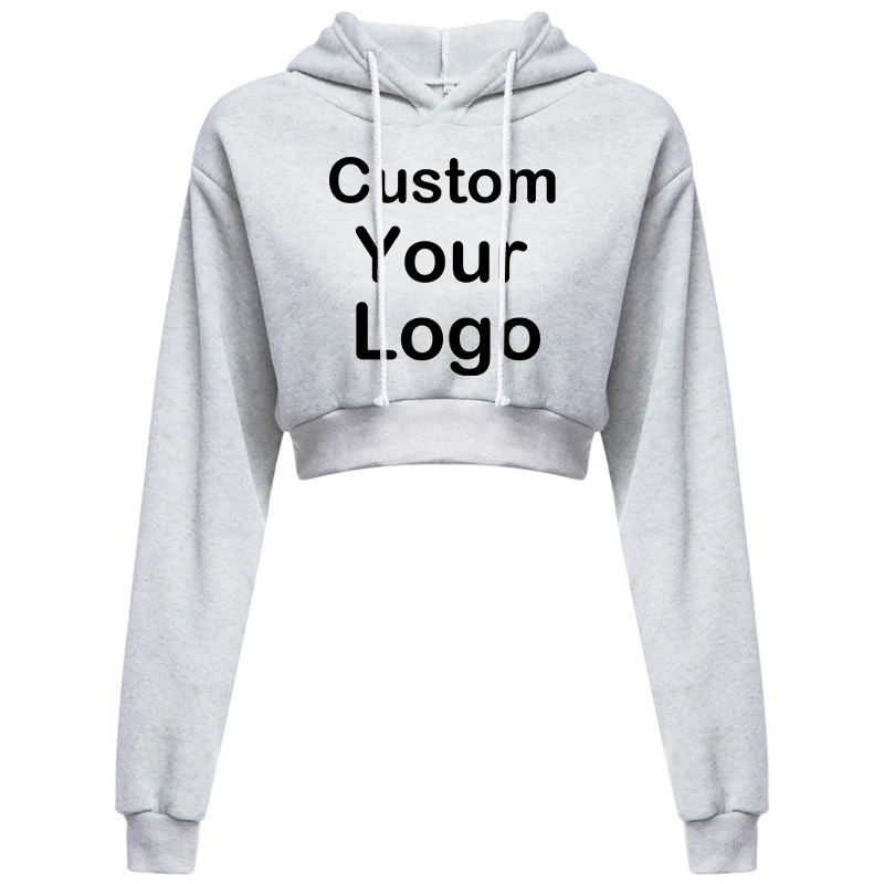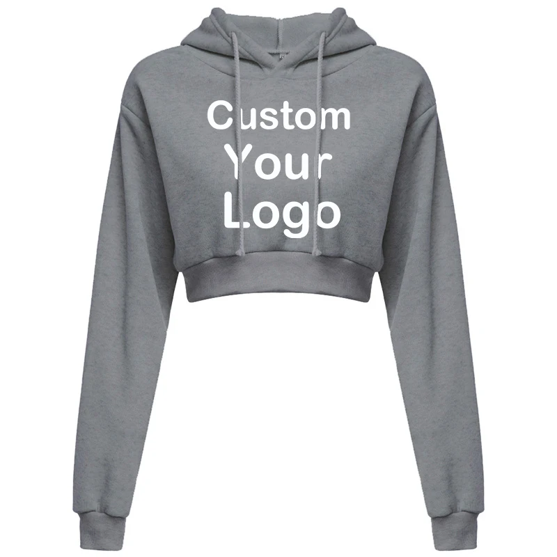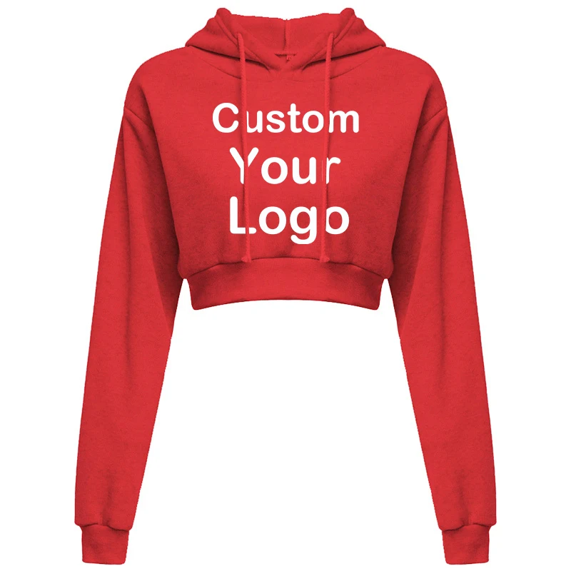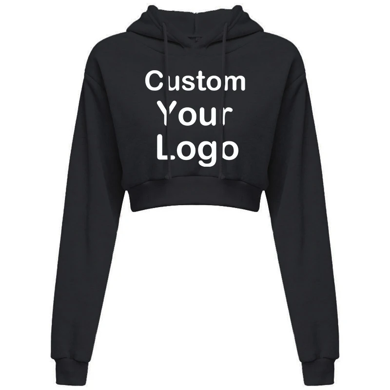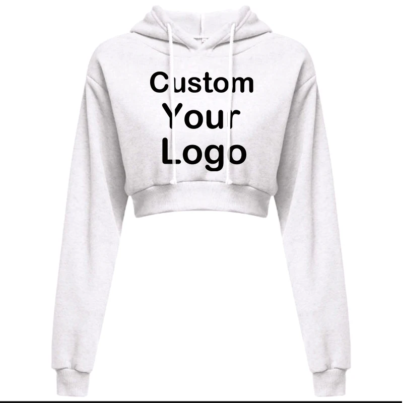 Customized Logo Print Crop Hoodie Women Spring Autumn Pullovers Ladies Solid Color Drawstring Hooded Full Sleeve Sweatshirt
