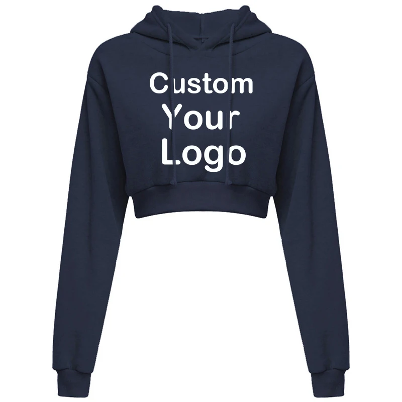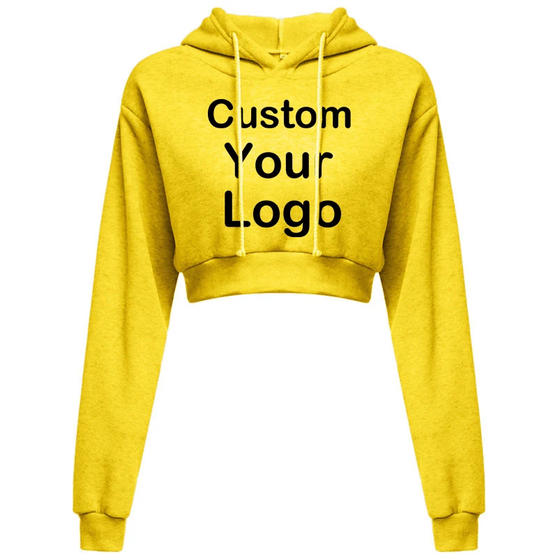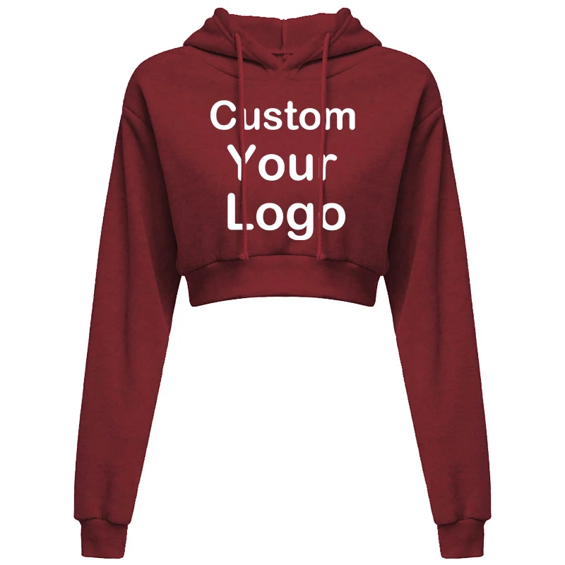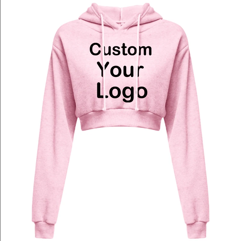 Customized Logo Print  Crop Hoodie Women Spring Autumn Pullovers Ladies Solid Color Drawstring Hooded Full Sleeve Sweatshirt