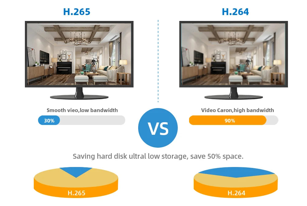 H.265 More Clear , HD resolution offer you best image quality in a lower bit rate.Save more storage space,can reduce 40%-50% file size,save your HDD storage space and reduce your purchase cost.