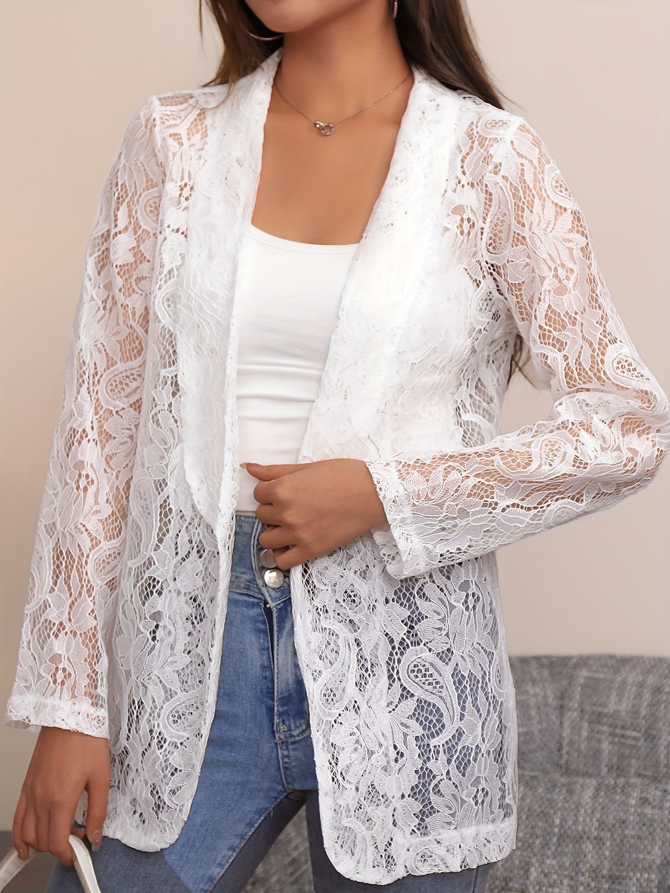 Floral Lace Lapel Blazer, Elegant Long Sleeve Open Front Outwear.