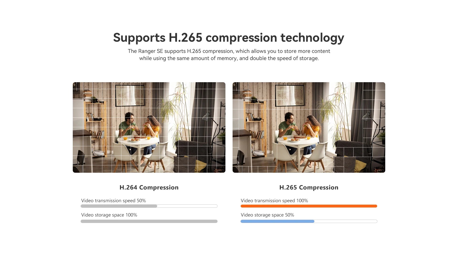 The Ranger SE supports H.265 compression, which allows you to store more content while using the same amount of memory, and double the speed of storage.