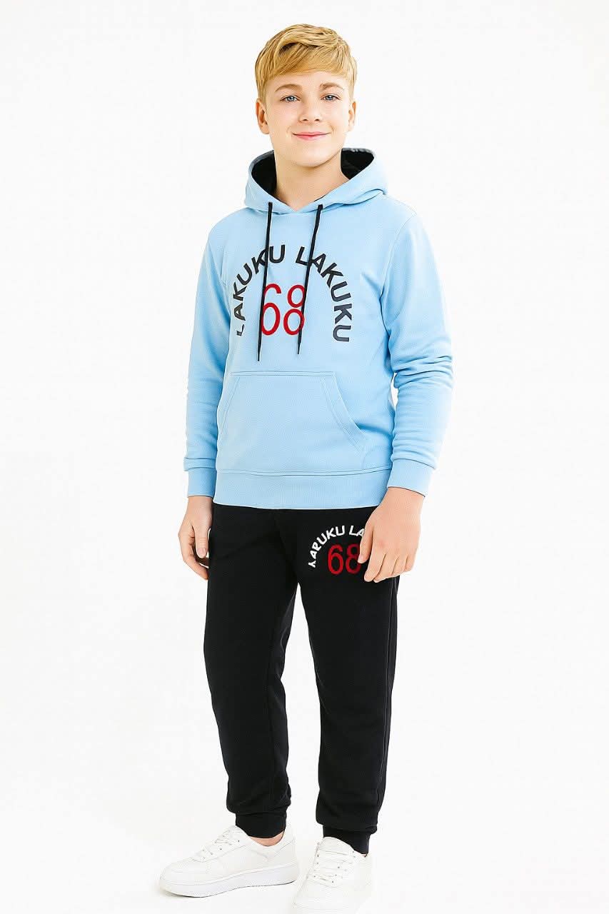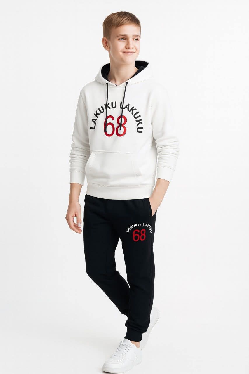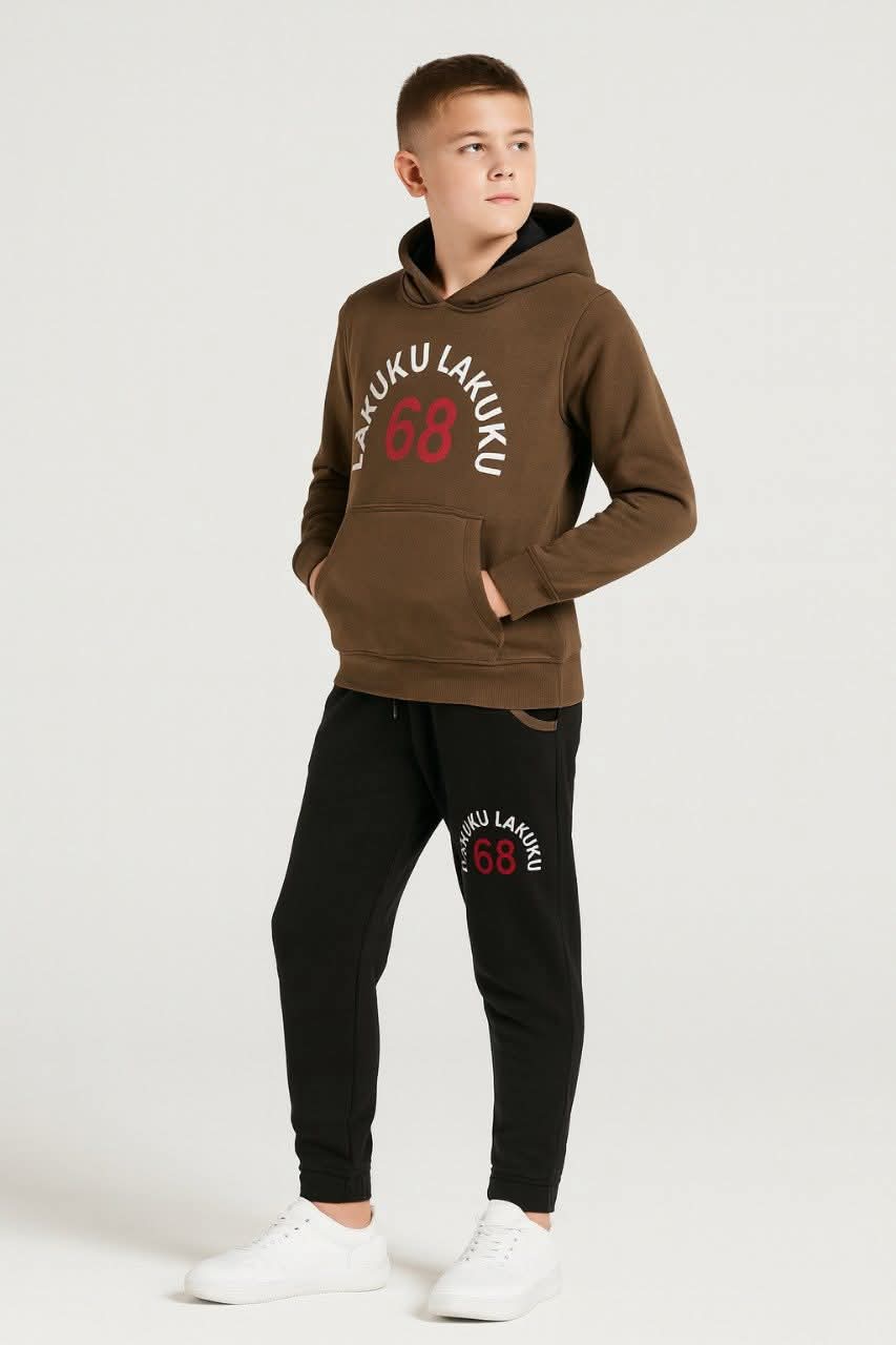 Make a statement with the LAKUKU 68 Tracksuit, featuring a vibrant Royal Purple hooded top paired with sleek Black joggers. This coordinated set is designed for ultimate comfort and standout style, whether for active play, school days, or just lounging at home. Both the hoodie and the joggers feature the bold 'LAKUKU 68' graphic print in contrasting white and red. The hoodie includes a practical kangaroo pocket and adjustable drawstrings, while the joggers have an elasticated waistband and cuffed ankles for a secure fit.