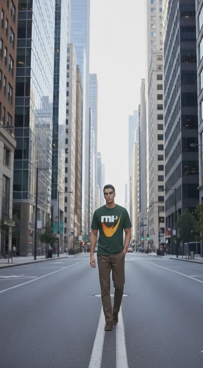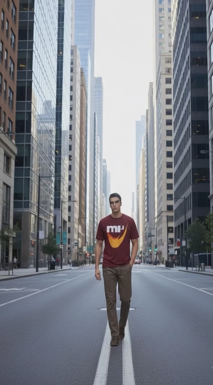 Elevate your everyday look with the MH Signature Tee, crafted from premium 180 GSM 100% cotton for unmatched comfort and durability. This crew neck T-shirt features a bold, modern print combining the initials “mh” with a dynamic swoosh graphic in striking red-orange and golden-yellow tones—an artistic nod to speed, style, and individuality.