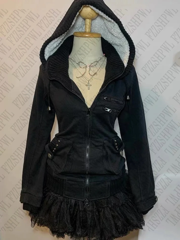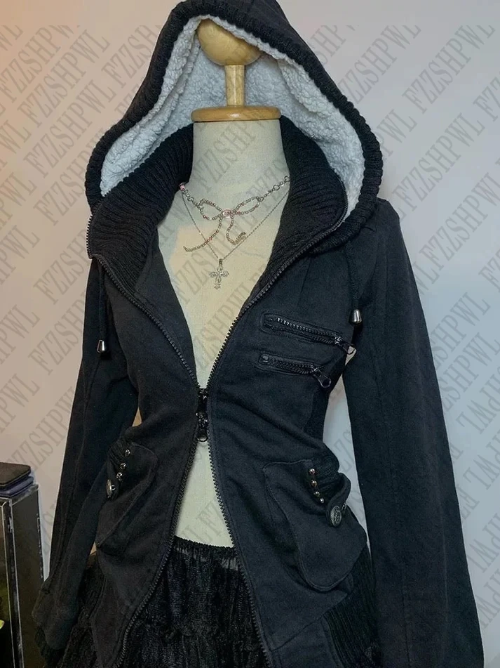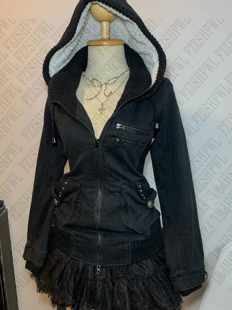 Winter riveted cool girl Gothic zipper hoodie coat cardigan jacket.