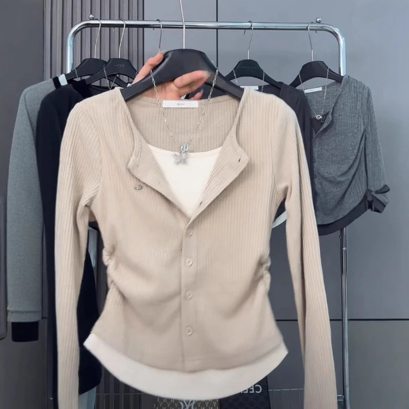 Plus Size Casual Retro Long Sleeves Knitting T-Shirt Women's Spring Fake Two-Piece Shoulder T-shirt Chubby Girl Slim Fit Slim...