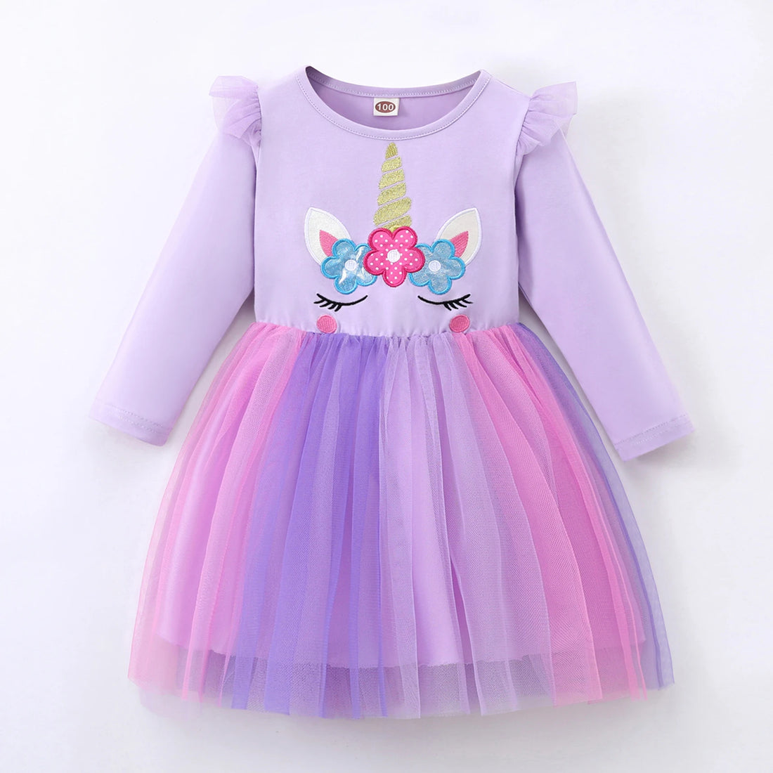Kids Girls Long Sleeved Tutu Dress Unicorn Embroidery Colorful Dress .