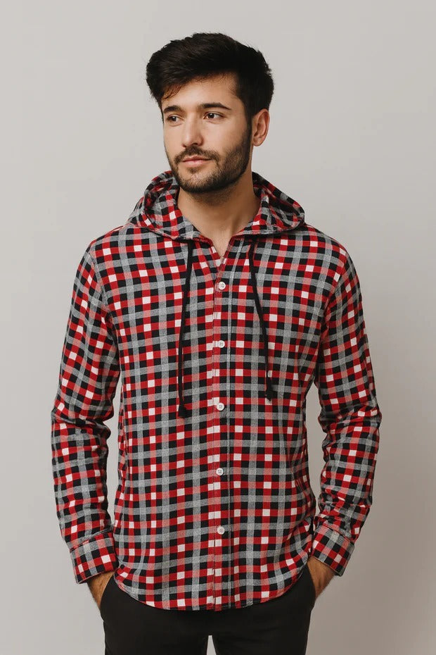 "Men’s Red & Olive Checkered Hooded Casual Shirt – Full Sleeve" / MH