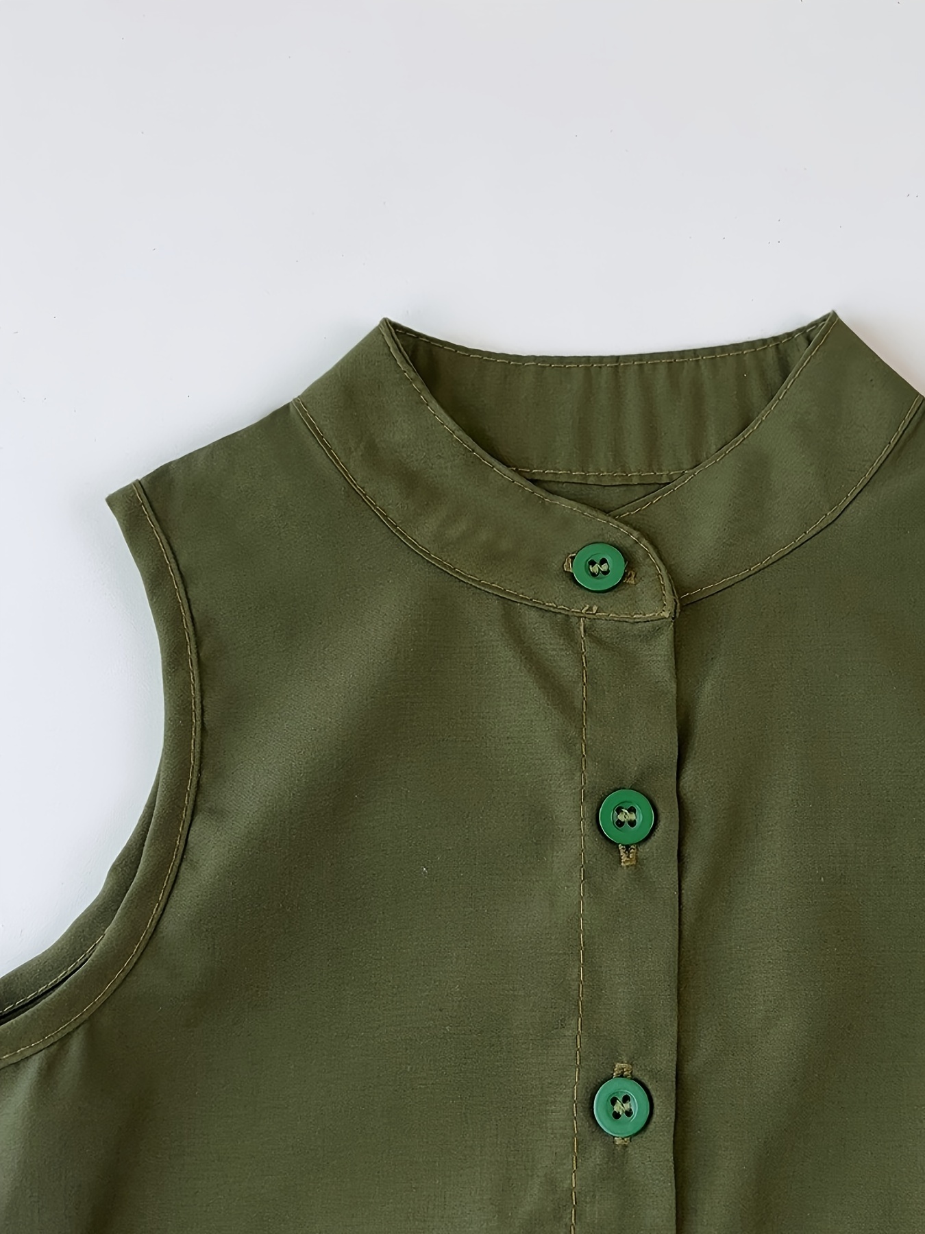 2pcs, Solid Color Sleeveless Front Button Collar Top + Pleated Skirt Set For Girls,