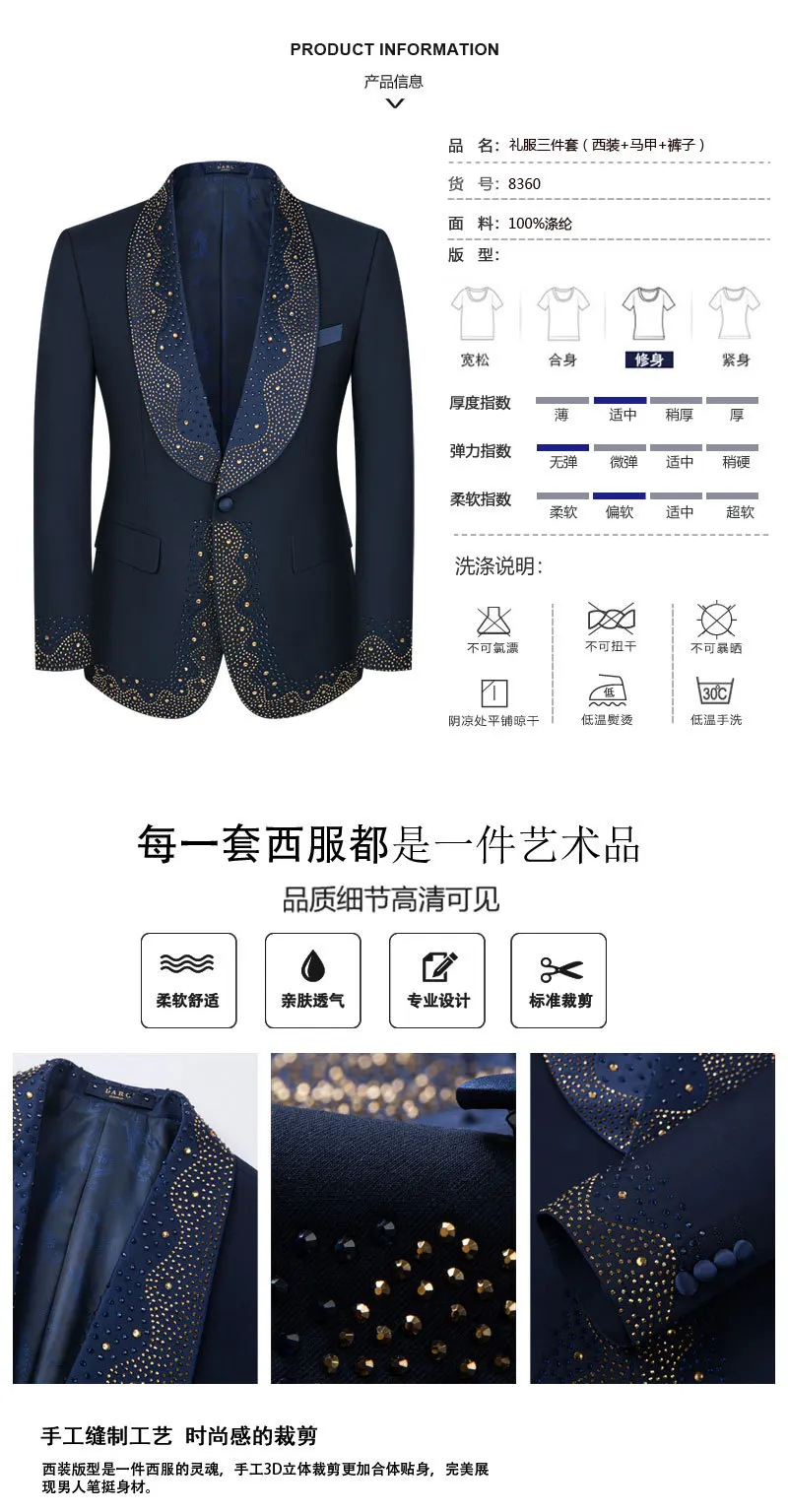 Elegant Groom Wedding Tuxedo Formal Prom Party Male Suit Slim (Blazer+Vest+Pants)