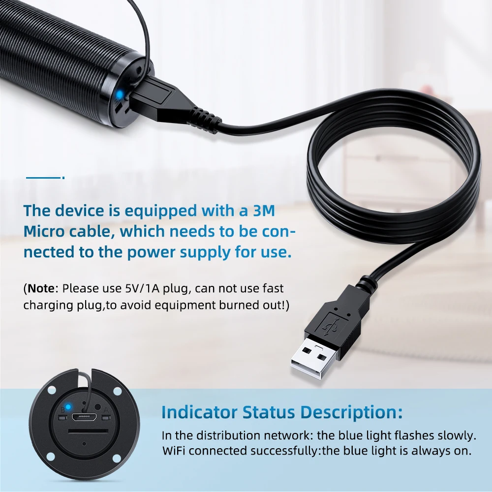The device is equipped with a 3M Micro cable, which needs to be connected to the power supply for use.