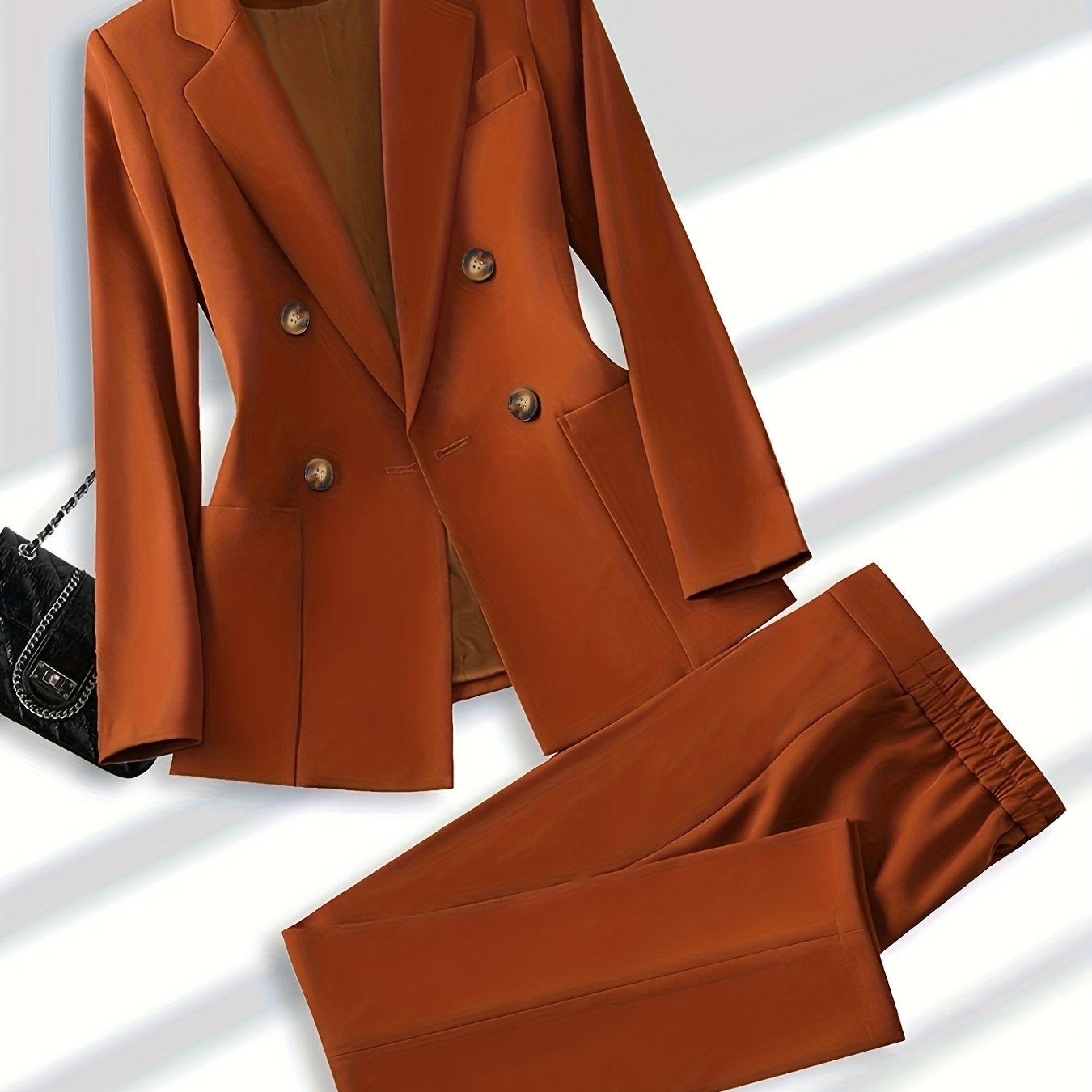 Elegant Office & Work Pants Set, Solid Color Double Breasted.