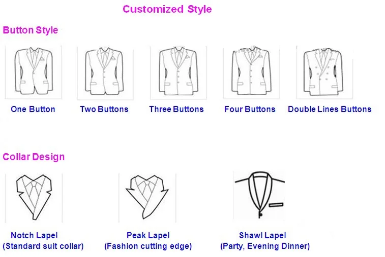 ( 1) Your design is also welcome. You can give me detailed pictures of men suits that you like. Then we can custom make the suits according to your requirement,like the size ,the color ,the designs .The customization cost is free.