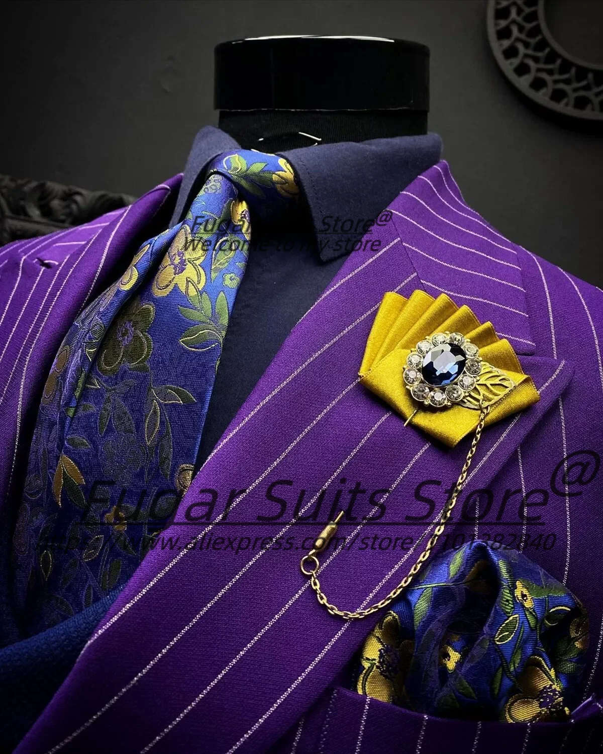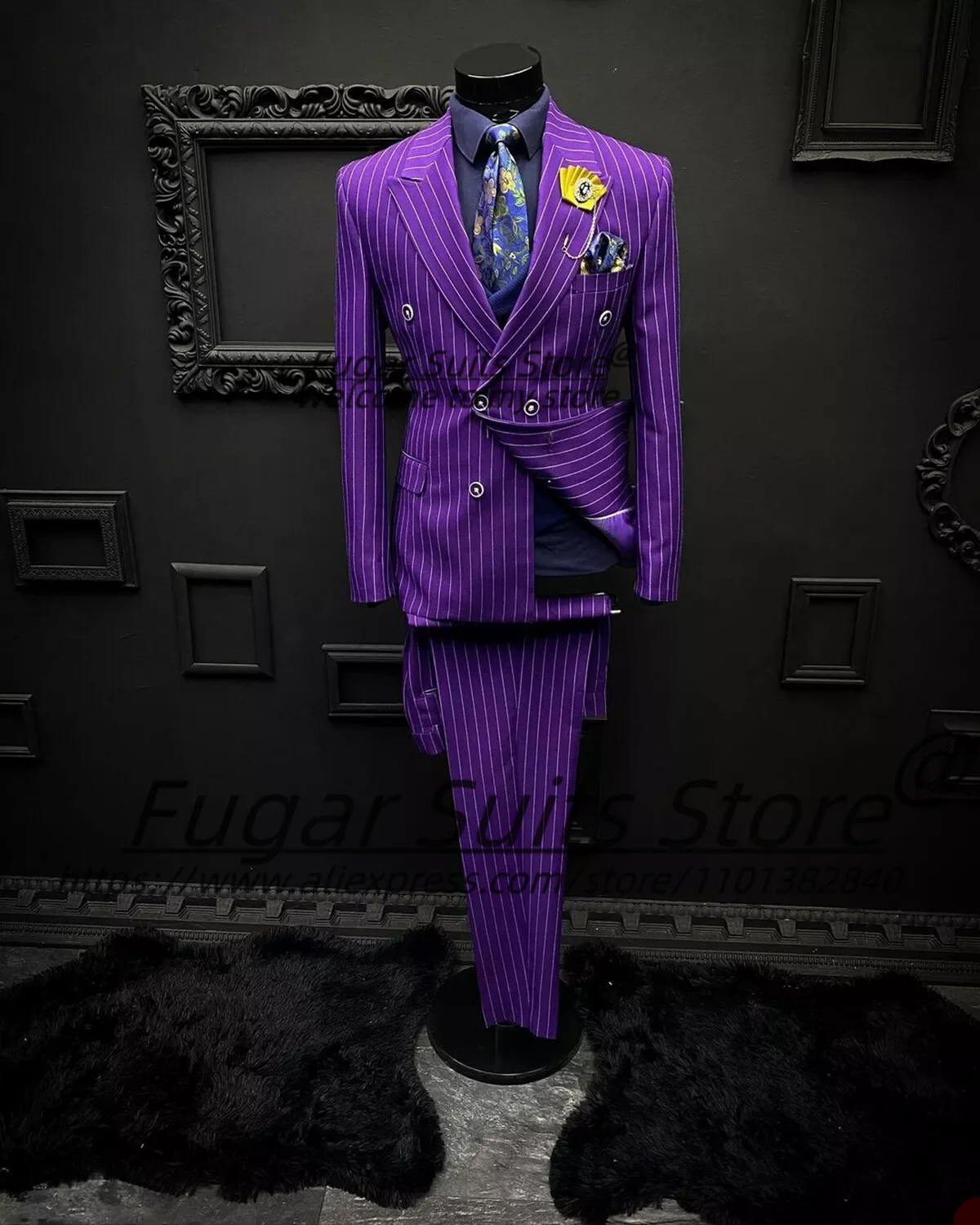 High-end Purple Stripe Men Suits Slim Fit Double Breasted Groom Formal .