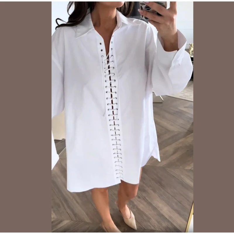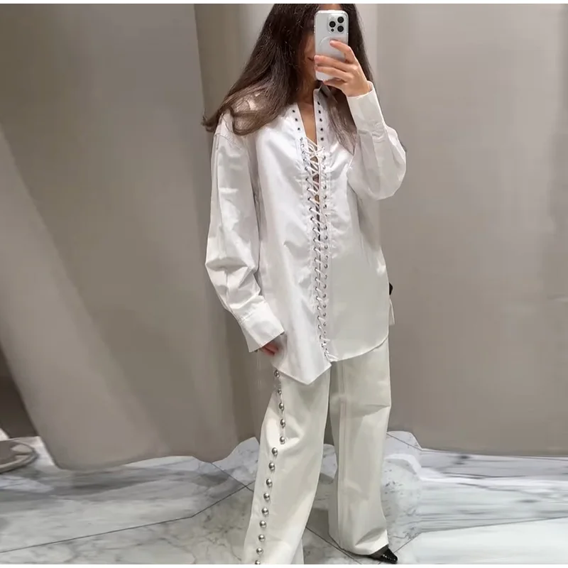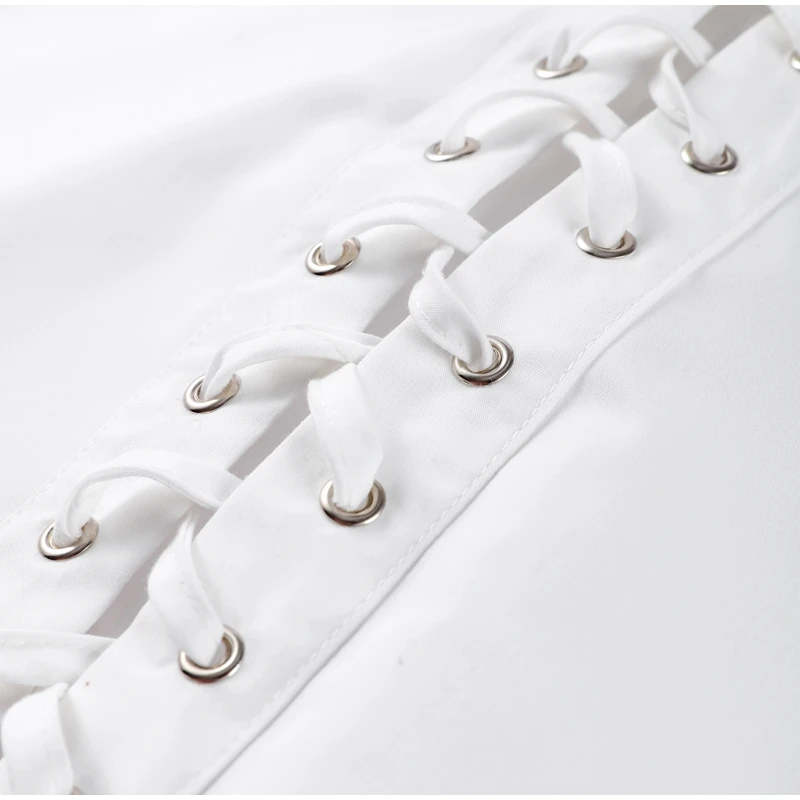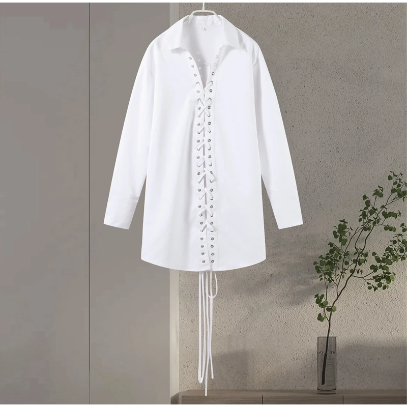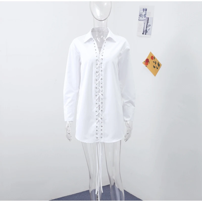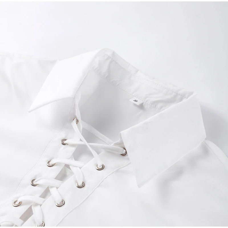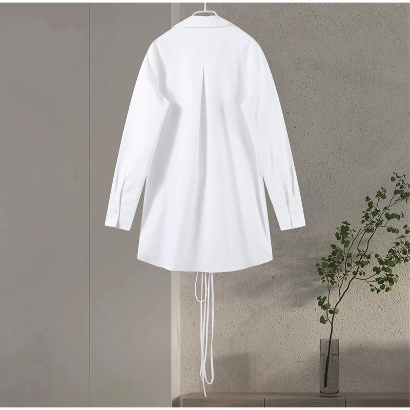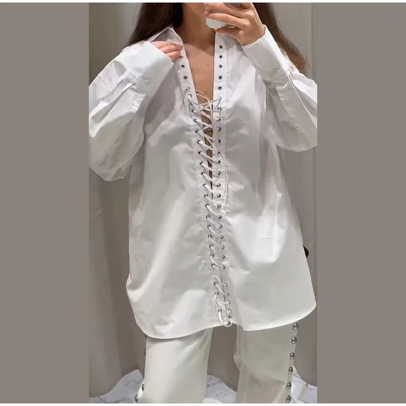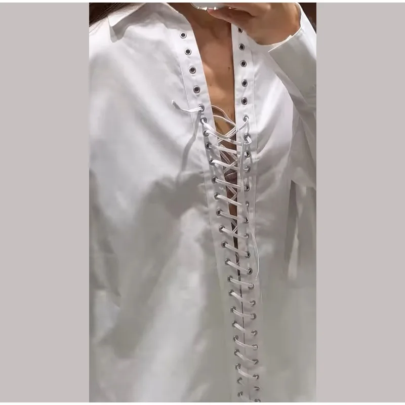 Solid Drawstring Bandage Women's White Shirts Elegant .