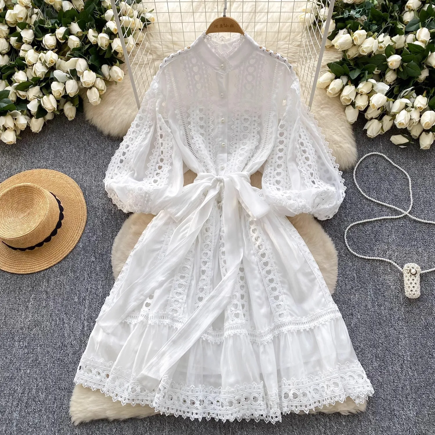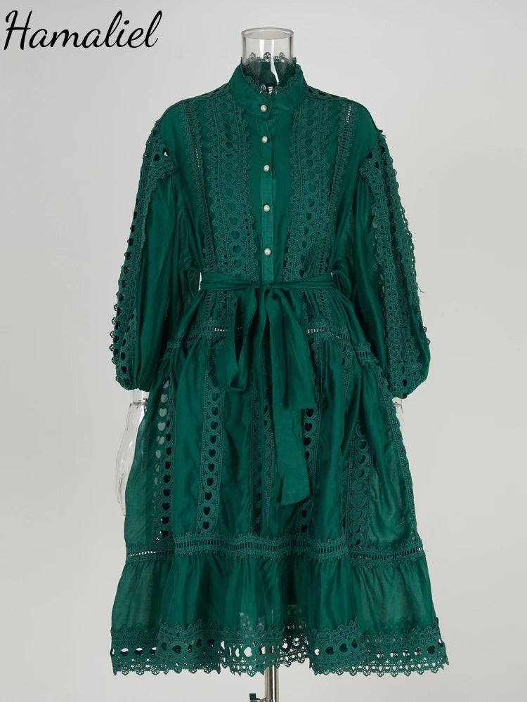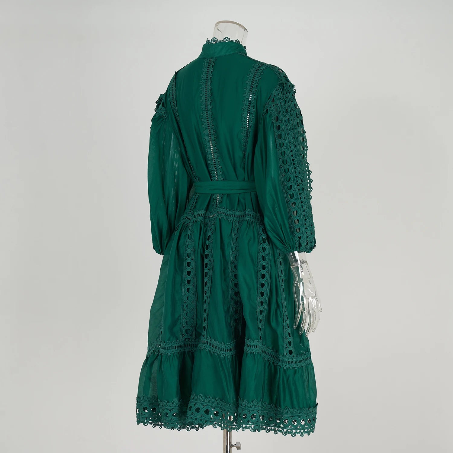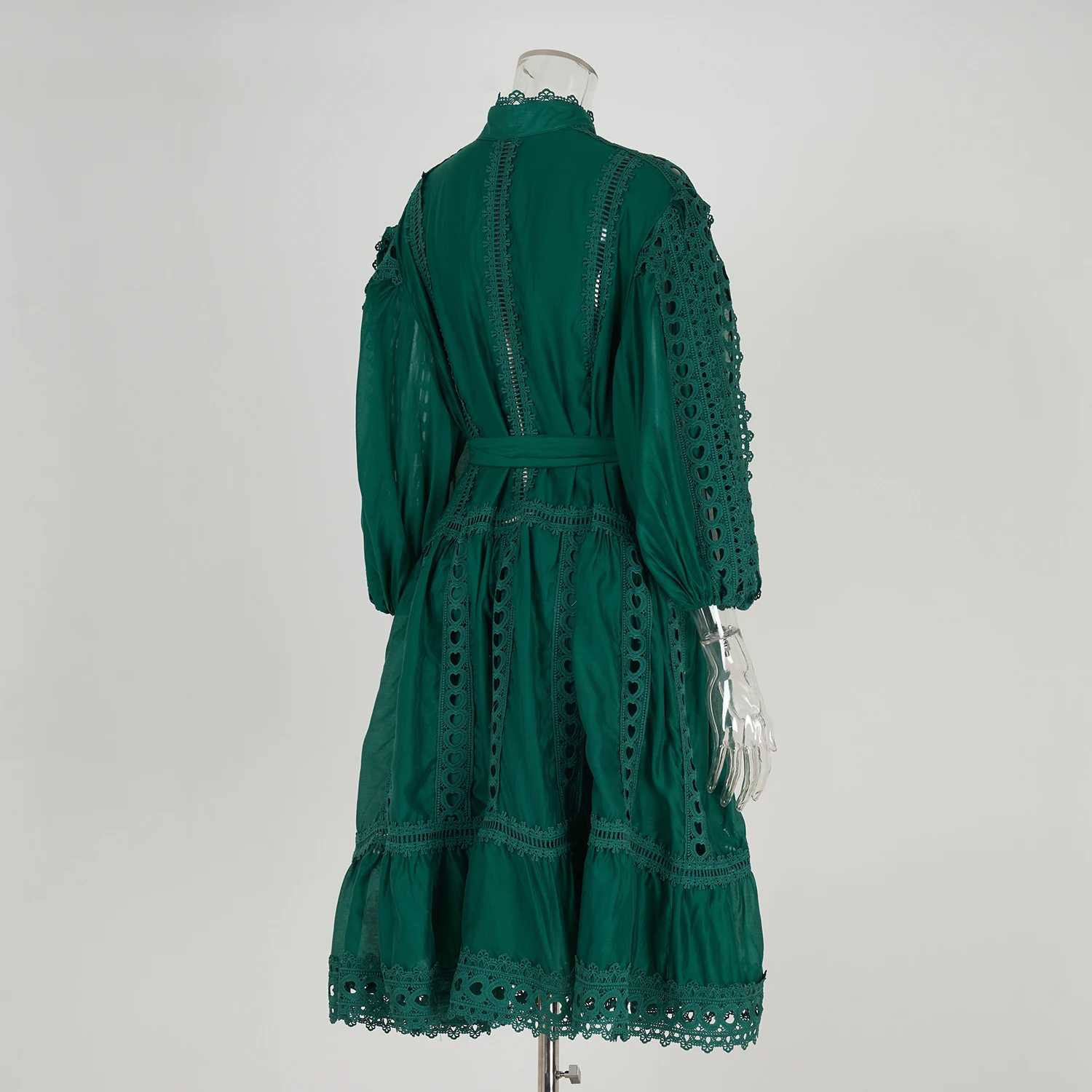 Spring Summer Embroidery Lace Stitching Hollow Out Midi Dress Women's Stand Collar Single Breasted Belt Loose Party Vestidos