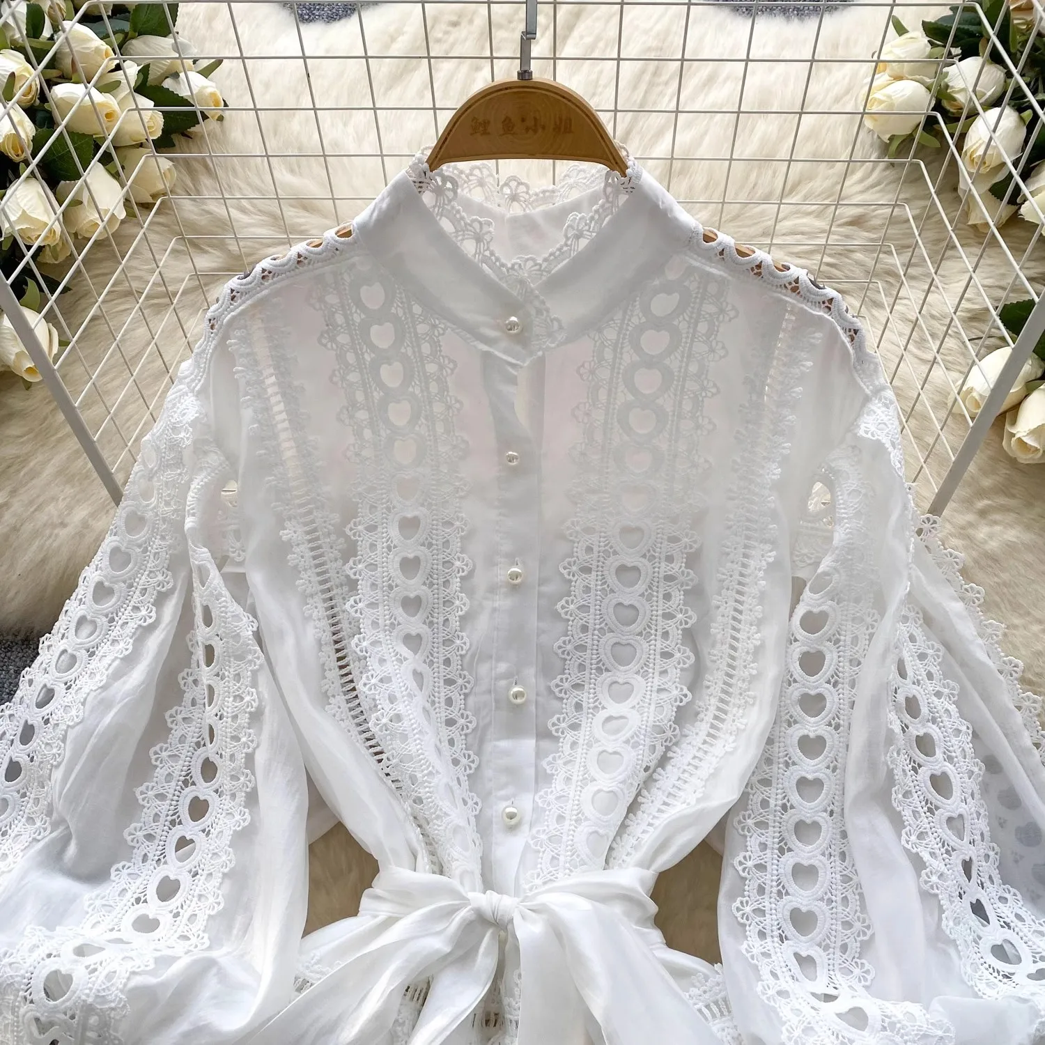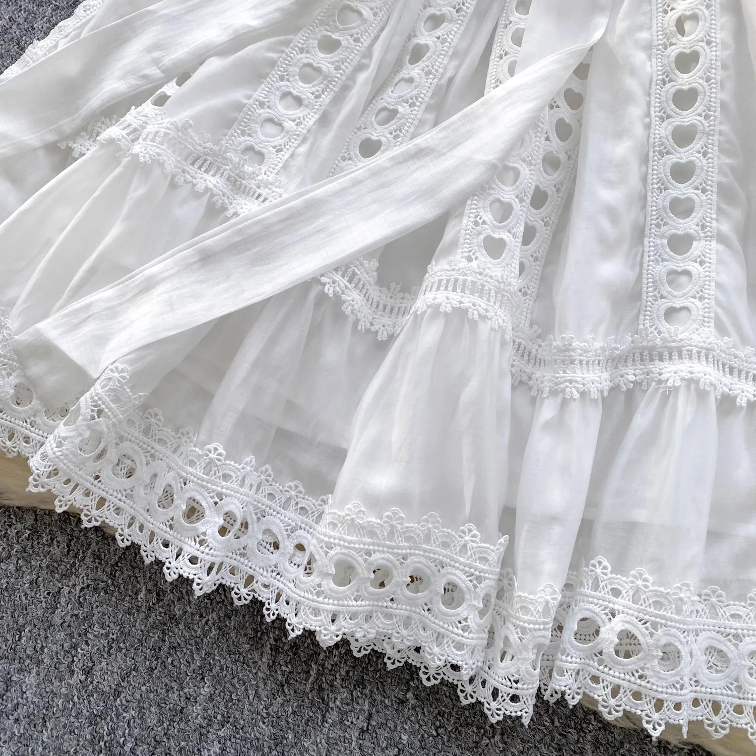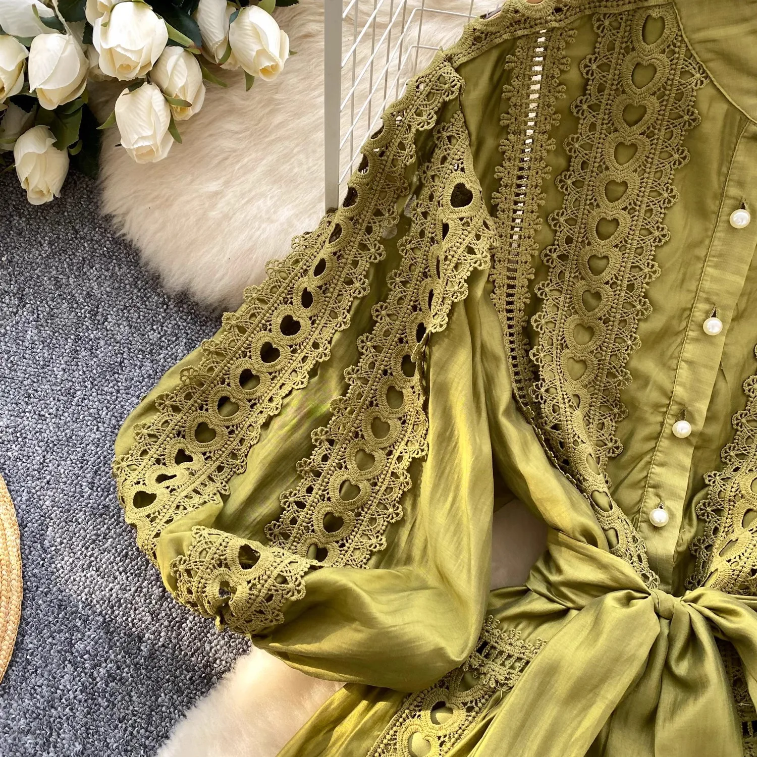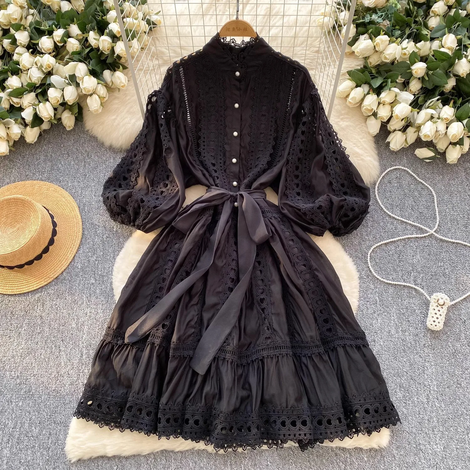 Spring Summer Embroidery Lace Stitching Hollow Out Midi Dress Women's Stand Collar Single Breasted Belt Loose Party Vestidos