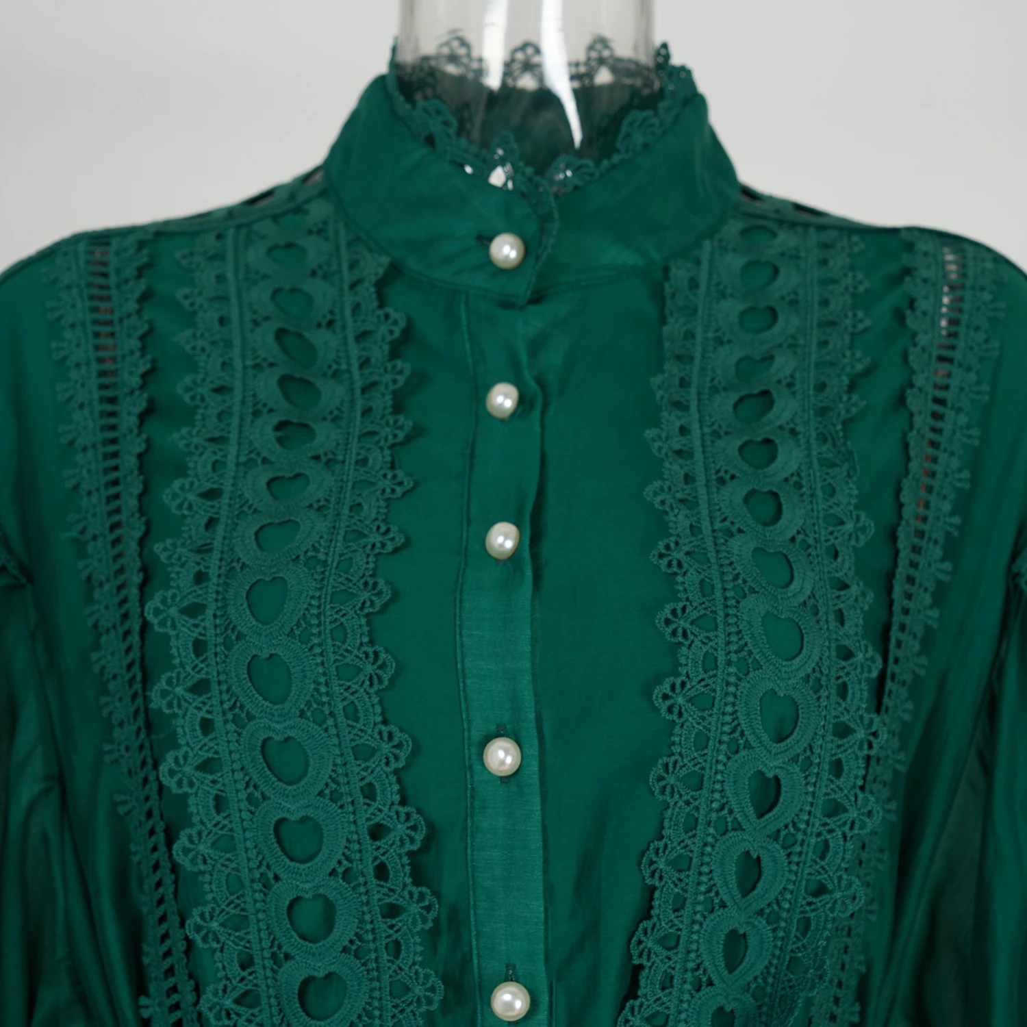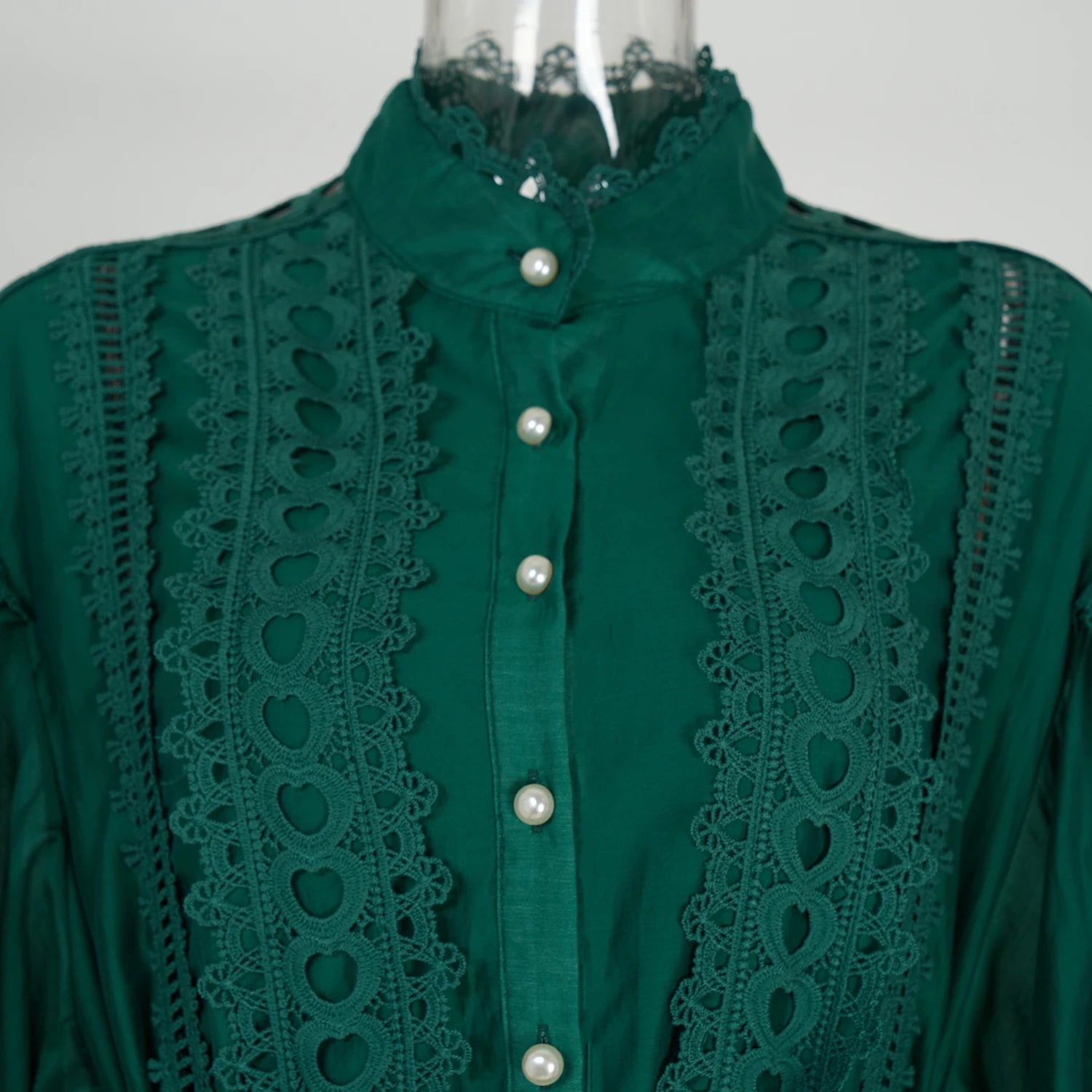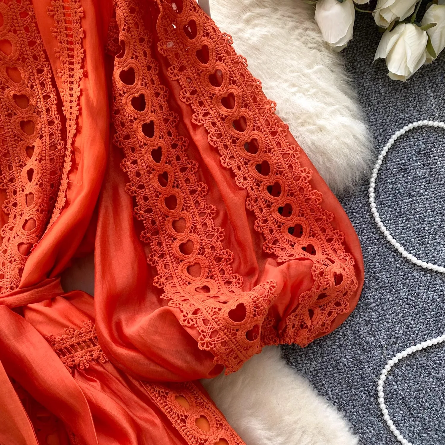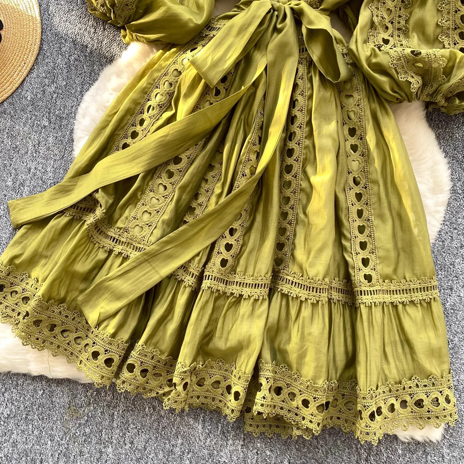 Spring Summer Embroidery Lace Stitching Hollow Out Midi Dress Women's Stand Collar Single Breasted Belt Loose Party Vestidos
