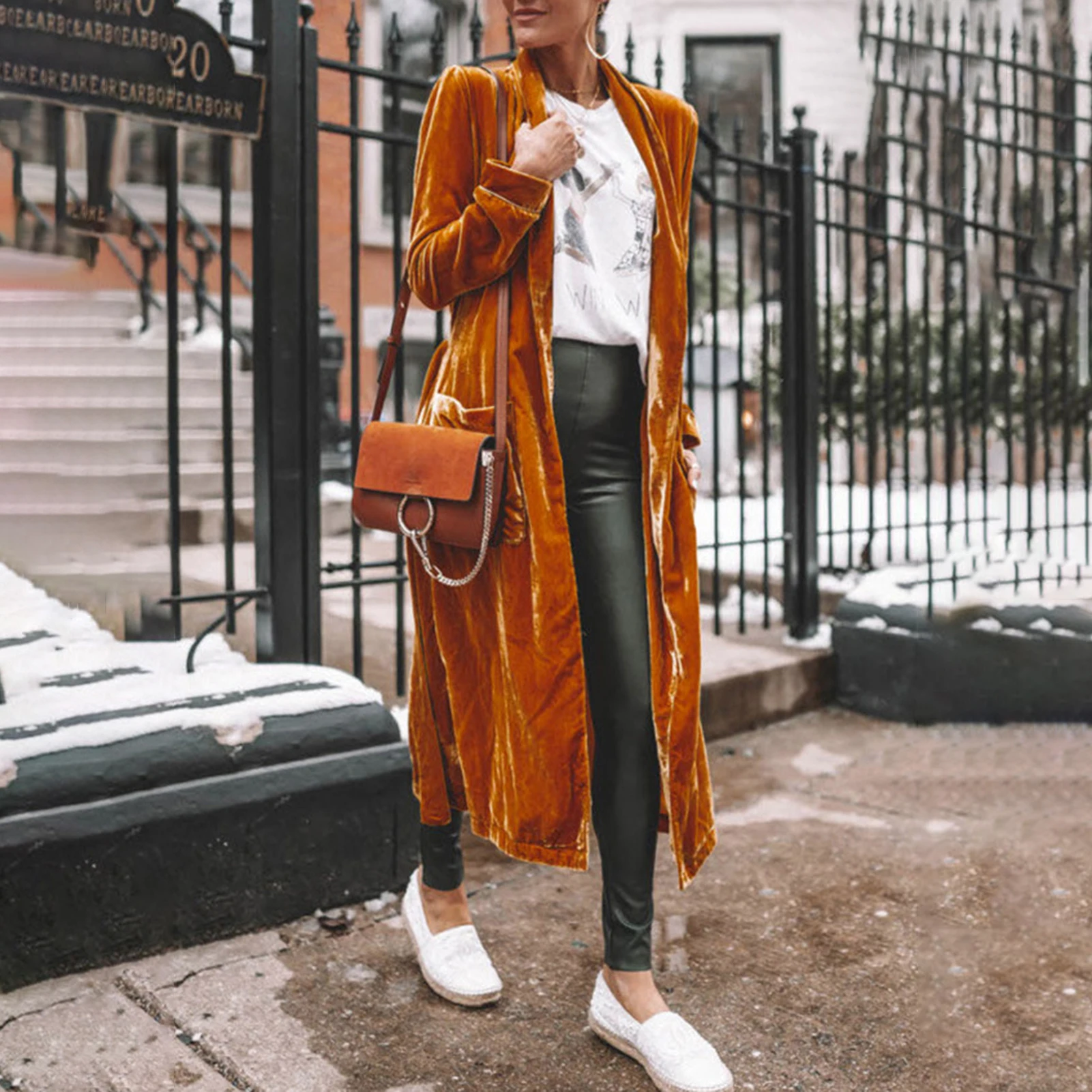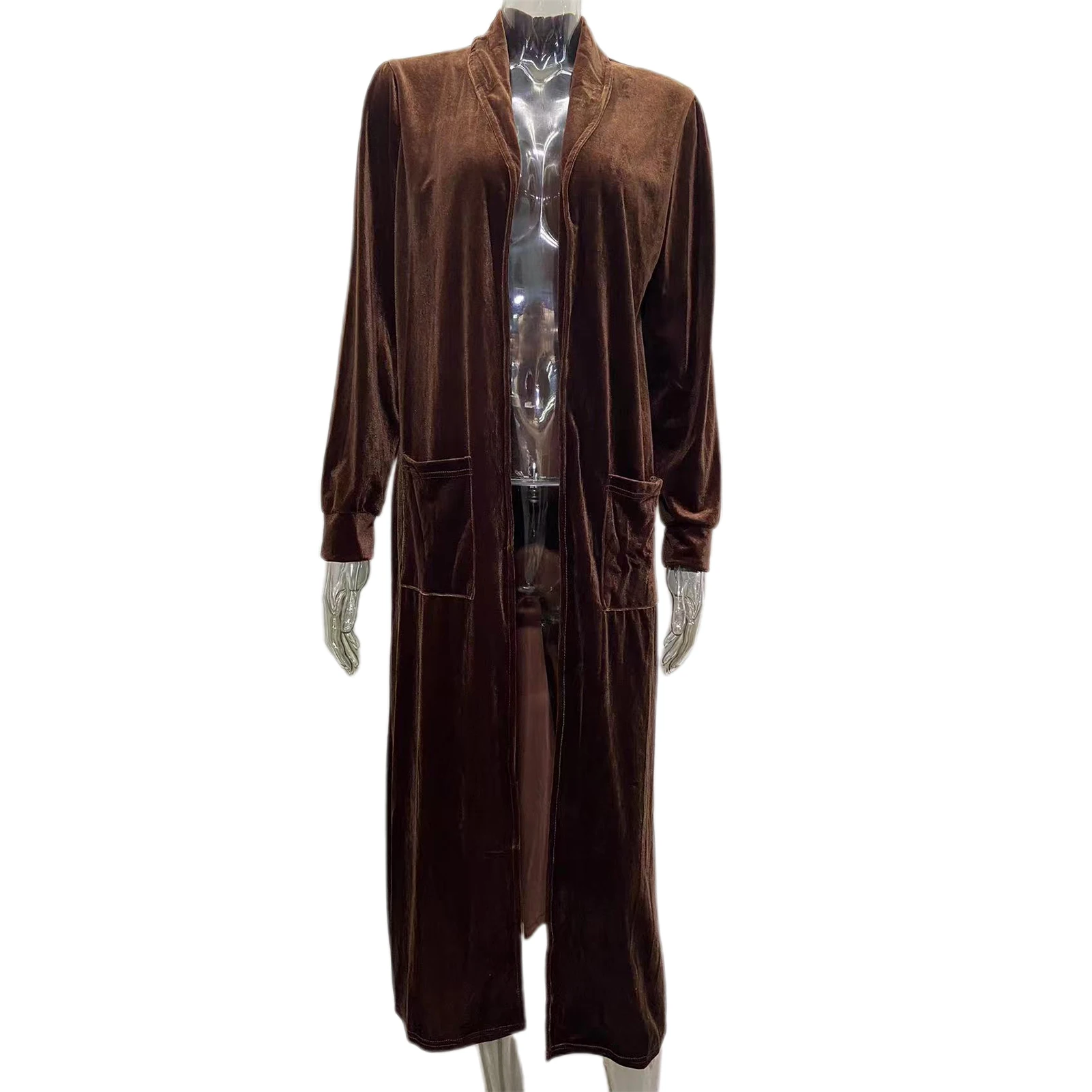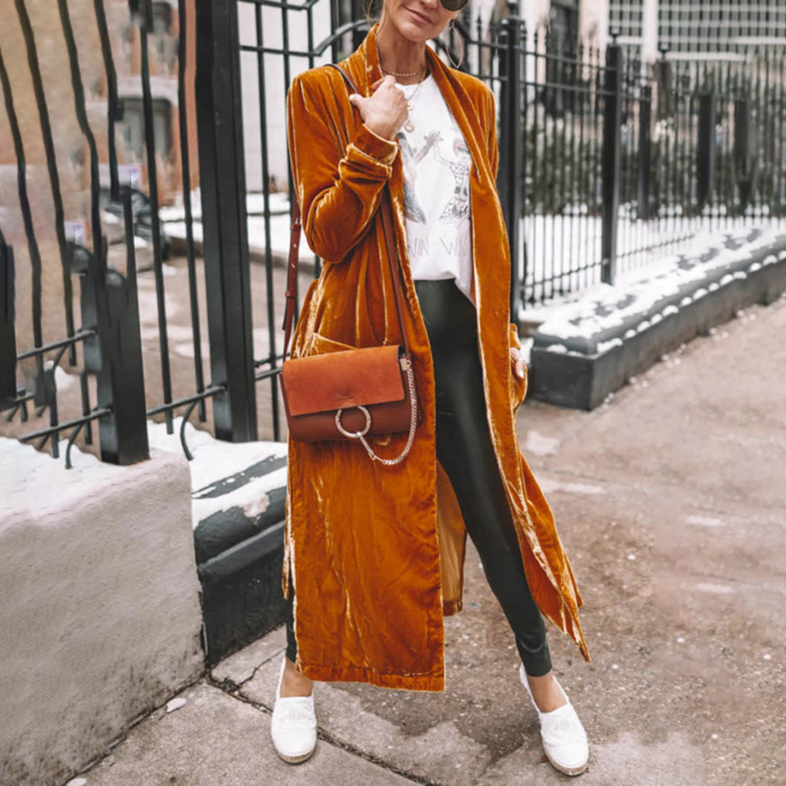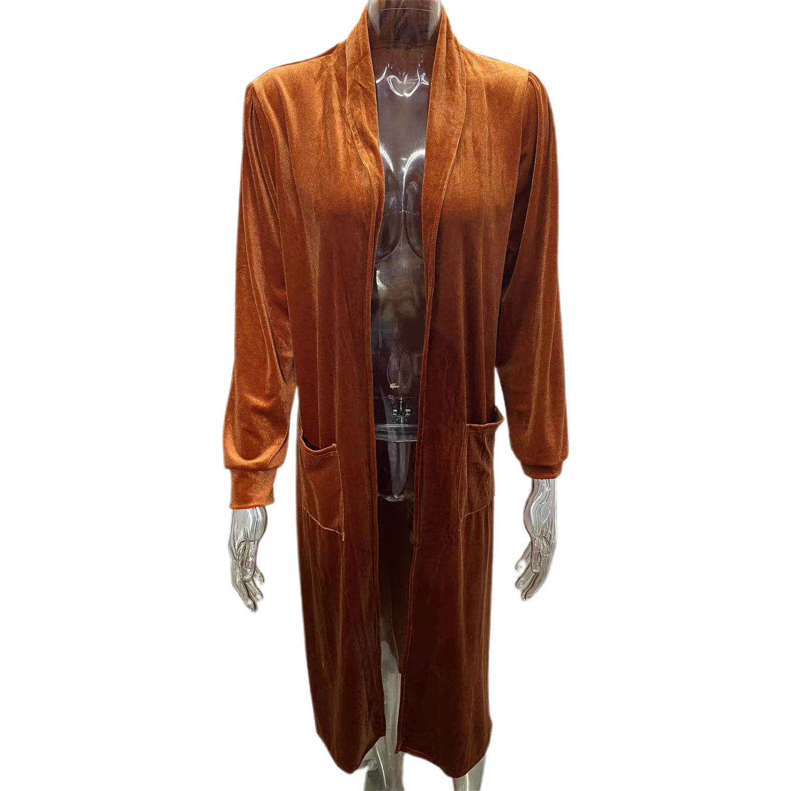 Women Cardigan Coat Lapel Long Sleeve Open Front Golden Velvet Fabric Jacket Solid Color Mid-length Outerwear