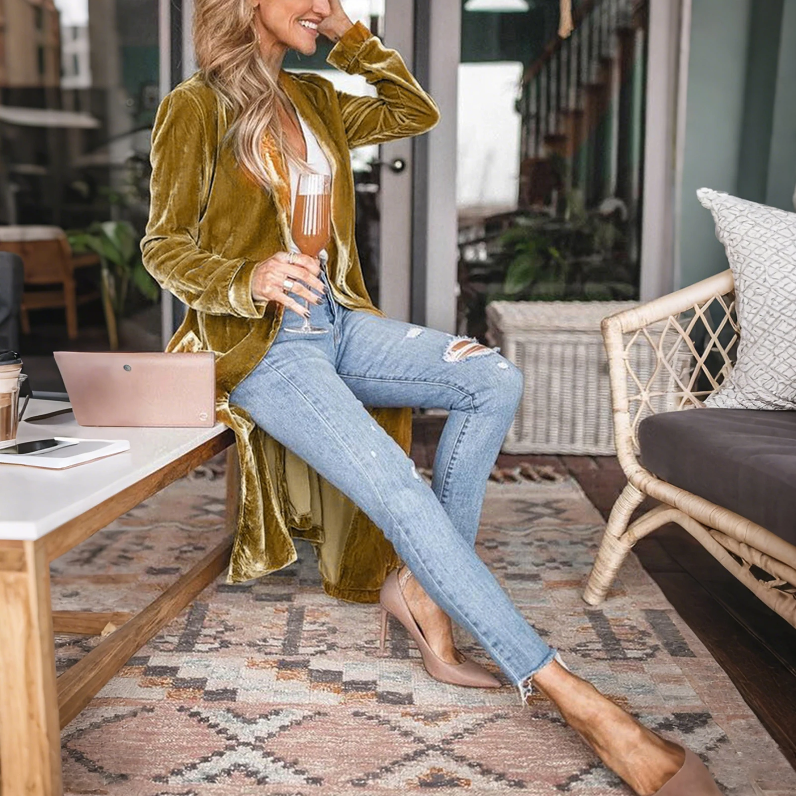 Luxurious Material: Crafted from a premium blend of polyester and golden velvet fabric, this cardigan coat offers a breathable and skin-friendly experience. Light and comfortable, it ensures a delightful wearing sensation.