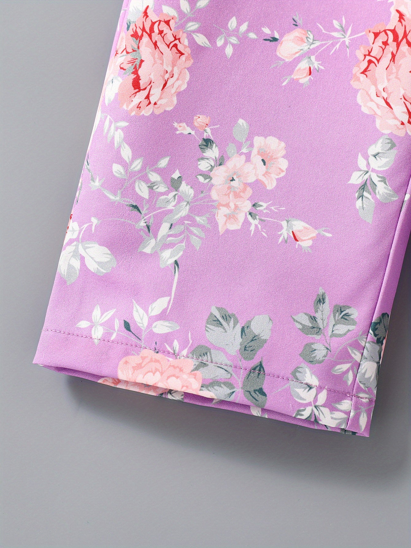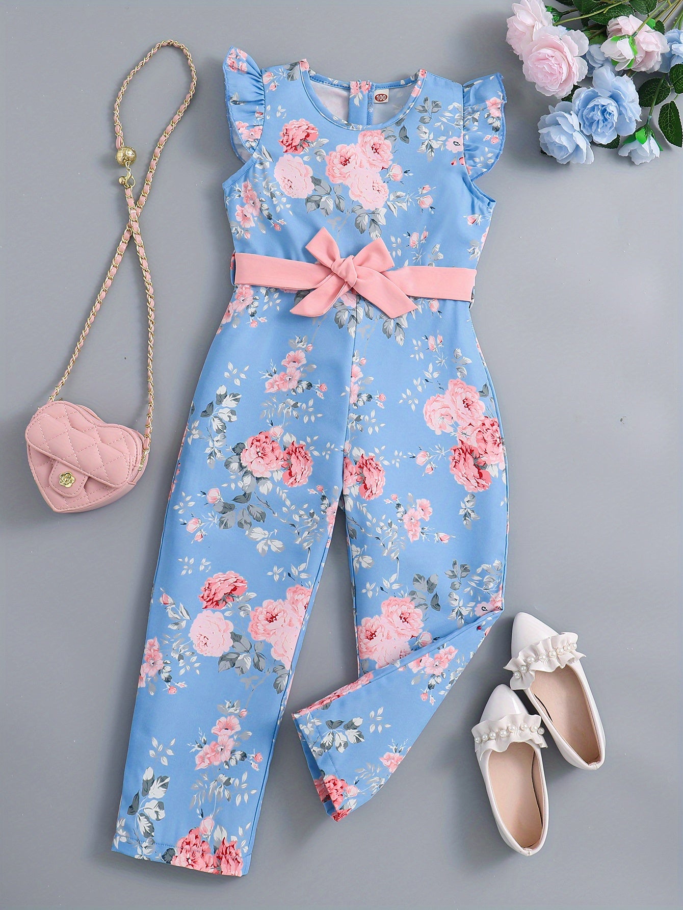 Toddler Girls Flowers Graphic Flutter Sleeve Belted Rompers Wide.