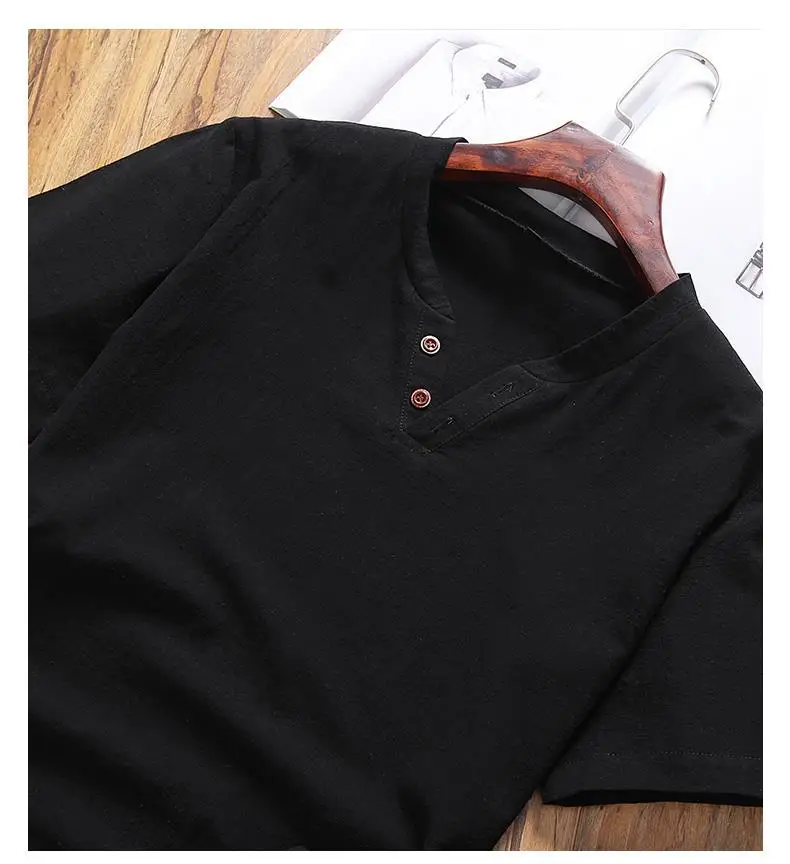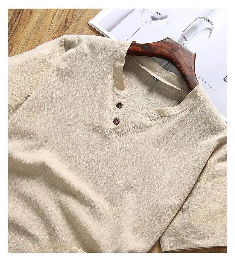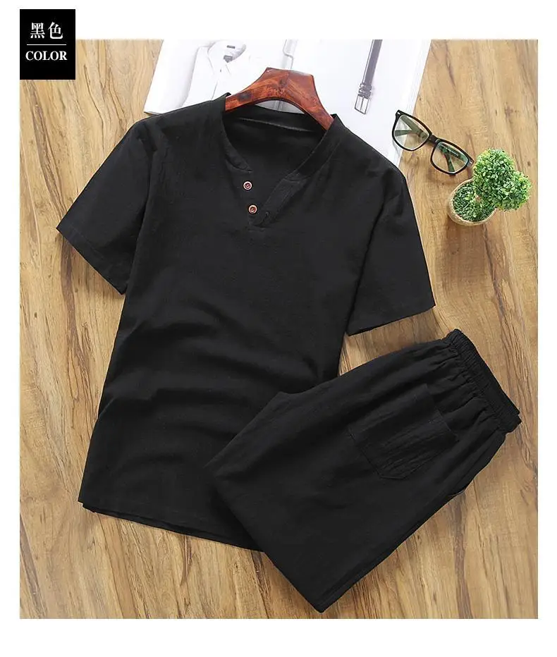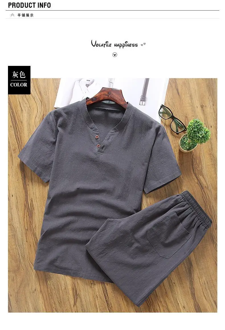 Two Piece Set Men Summer Vintage Simple Casual V Neck Short Sleeve Cotton Linen T Shirt Vacation Solid Loose Beach Shorts Ropa