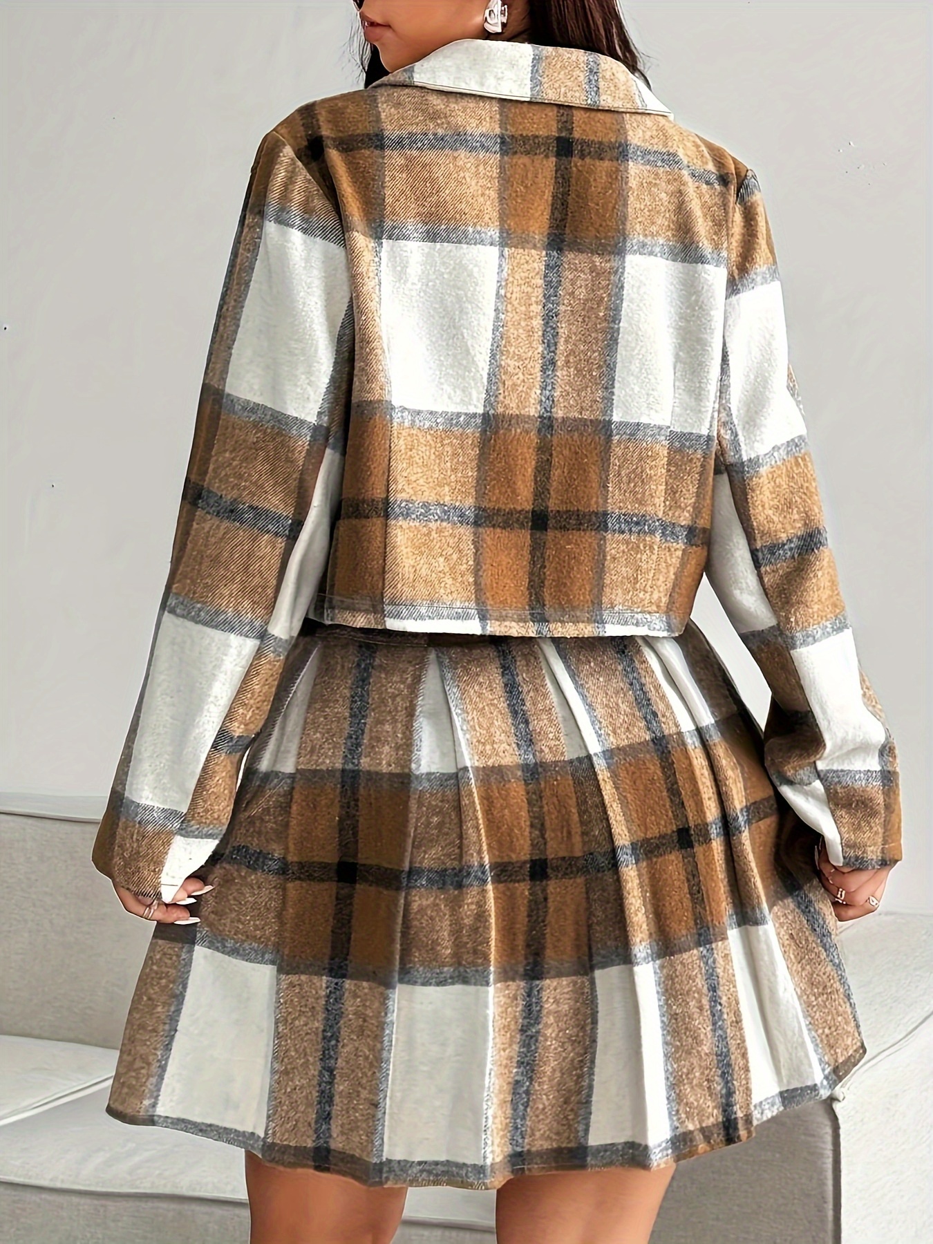 Women's Elegant Plaid Blazer and Pleated Skirt Set,